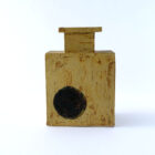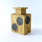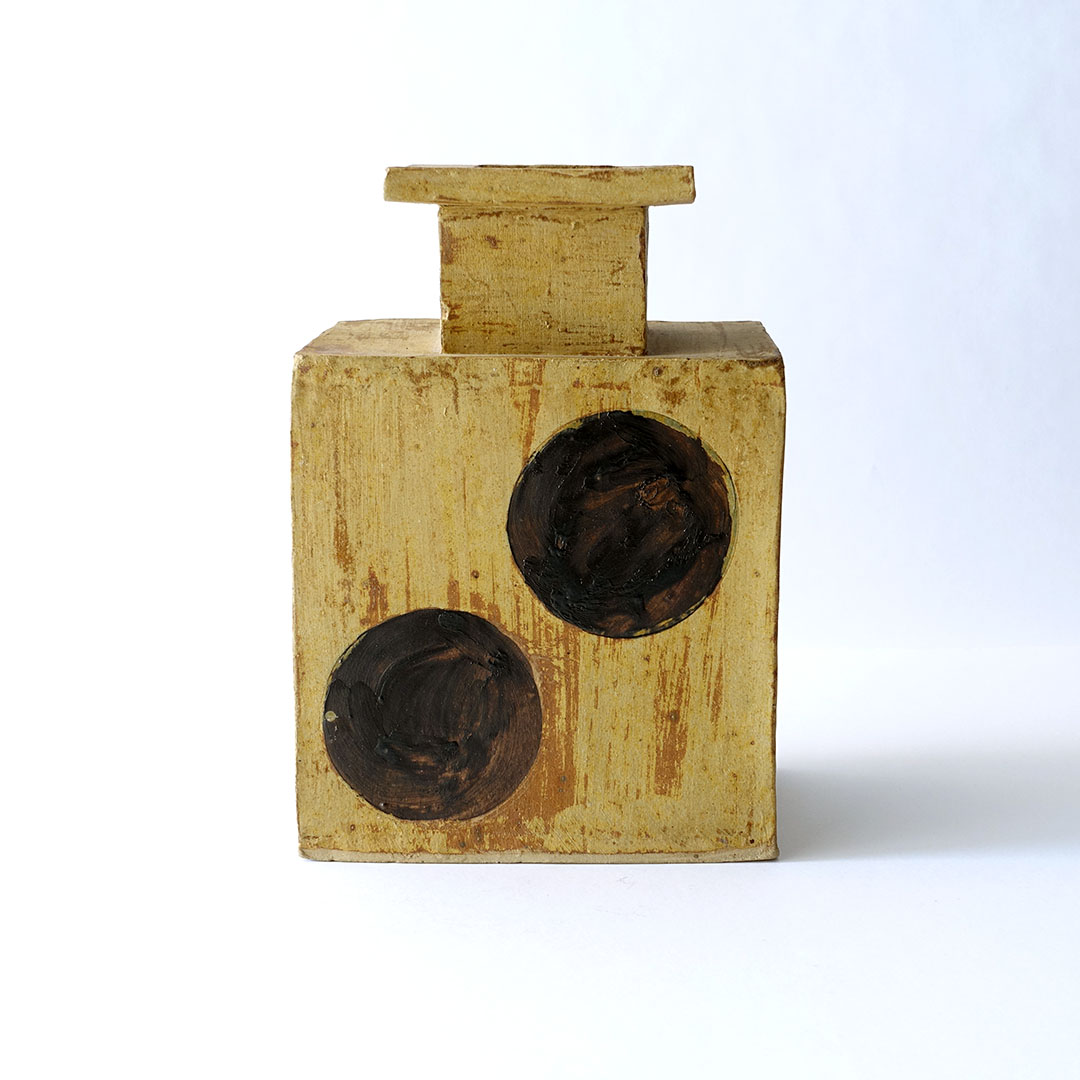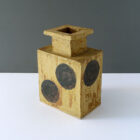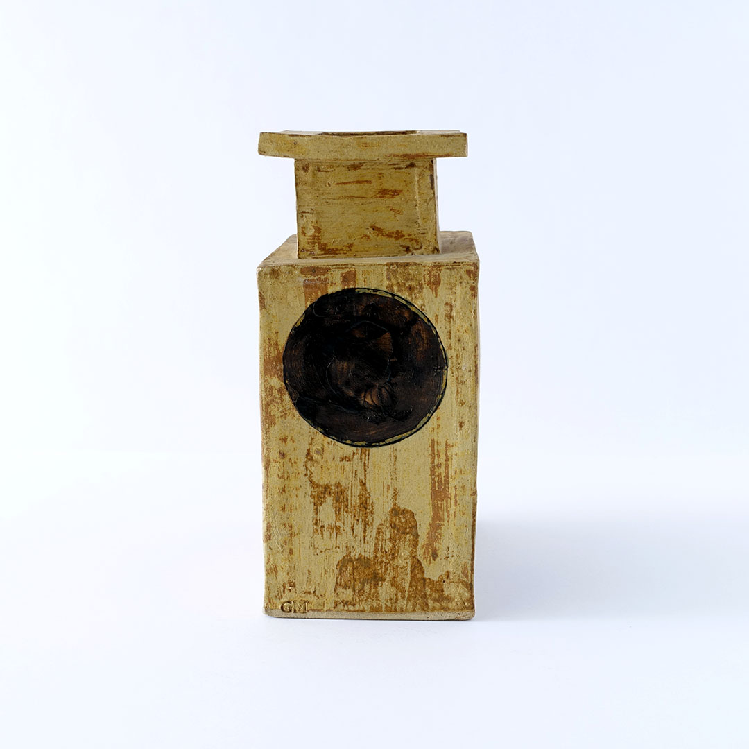 A new shop favorite. This incredible bottle shape vase has all of the elements we love about studio pottery. It is beautifully constructed using the slab technique, with crisp clean edges on all sides. It is sturdy, heavy, solid, not wobbly or askew. It has clean Bauhaus geometry based on a perfect square. It features another geometric shape, the circle, depicted in different combinations on each side. The resulting graphic design is somewhat playful. A bit like a giant domino or some other game piece. The matte glaze is a bit like fat lava glaze featured in the best West Germany pottery from the Mid-Century. The circles are hand painted and the brushstrokes are evident. It is signed with embossed initials G M. The underside is flat and unmarked. It is 9¼ × 7 × 4 inches. It weighs 5.8 lbs or 6.25 kg.