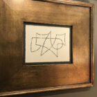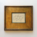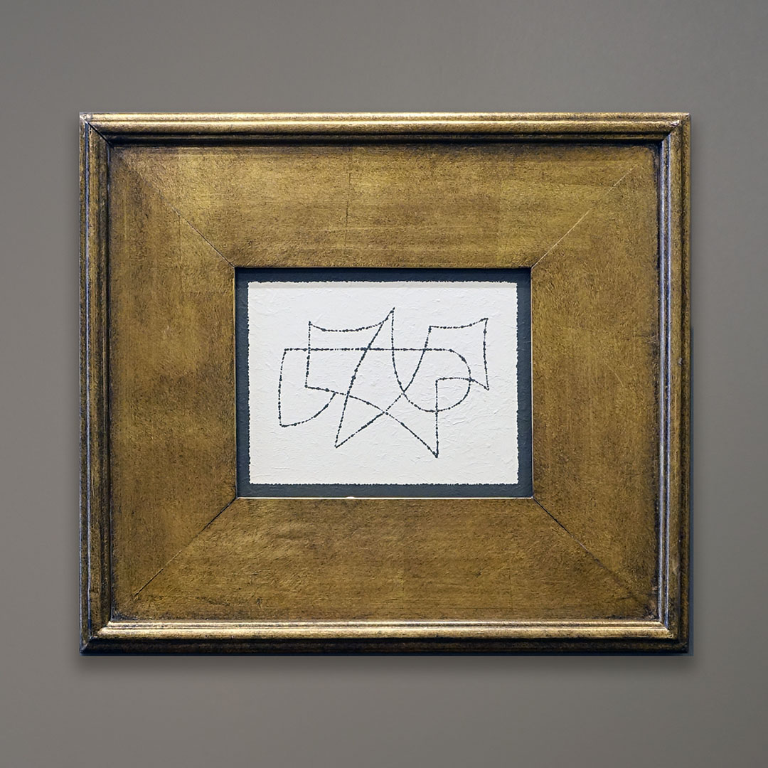 An original abstract painting by Michael Aron, 2019. Acrylic on masonite. 8 × 10 inches in a 17 × 20 inch vintage gold-tone frame. Michael Aron studied art and design at the Wooster School in CT, The Academy for Fine Art and Design in Belgium, Syracuse University, and got his BFA from the Cooper Union in NYC.