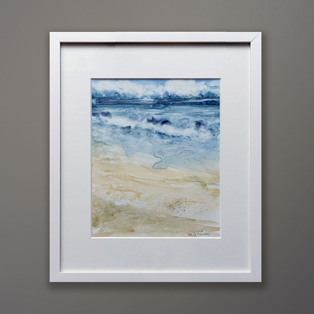 A curiously abstract water’s edge impressionist painting of Shelter Island, NY by Dee DeBernardis, an accomplished North Fork resident. She is working on a series “chasing sky colors.” An original watercolor painting. Masterful. Presented in a fine custom white wood frame with museum glass and 8-ply archival mat. 16 x 20 inches as framed.