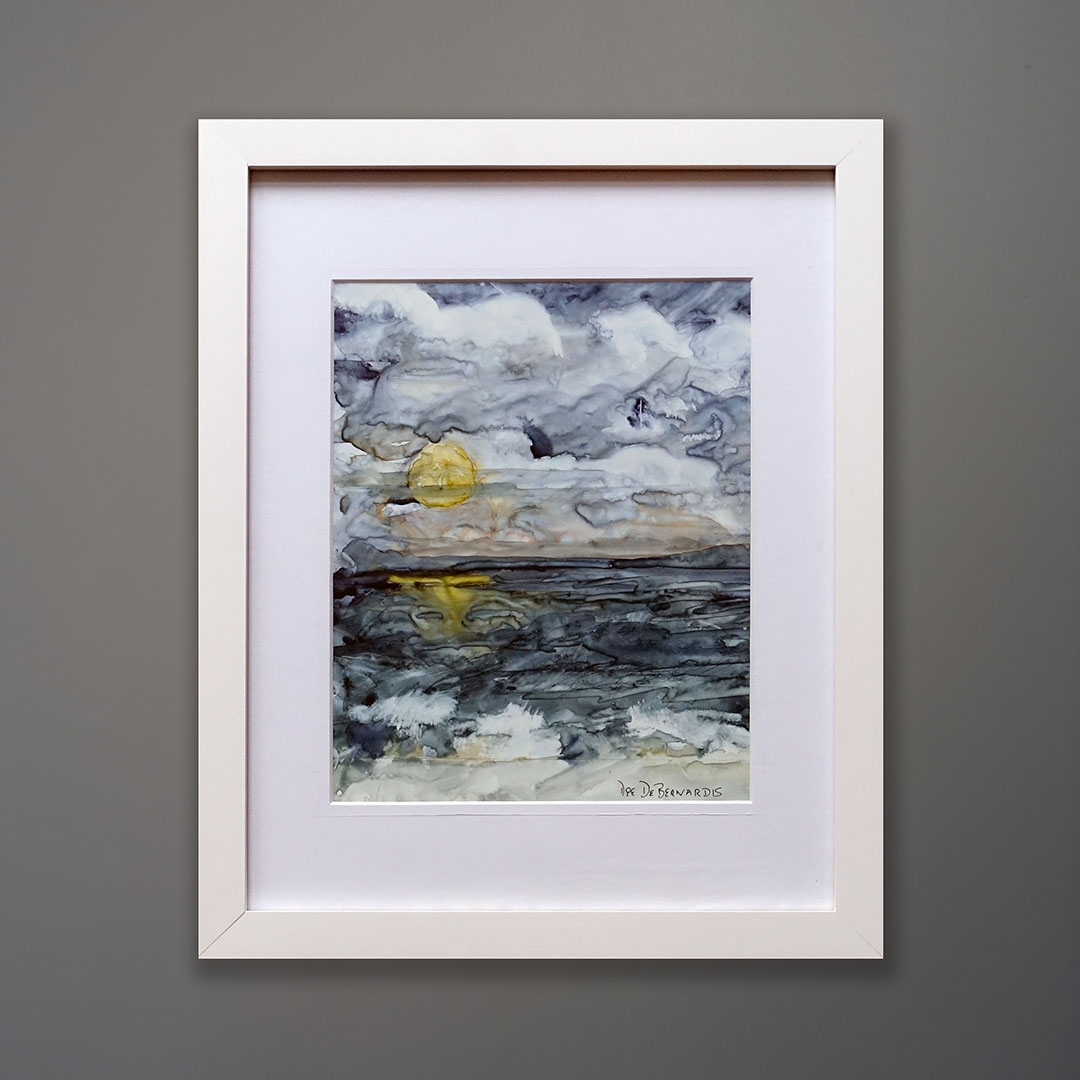 A curiously abstract water’s edge impressionist painting of Shelter Island, NY by Dee DeBernardis, an accomplished North Fork resident. She is working on a series “chasing sky colors.” An original watercolor painting. Masterful. Presented in a fine custom white wood frame with museum glass and 8-ply archival mat. 13 × 17 inches as framed.