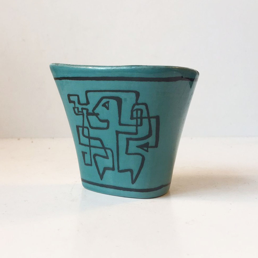 This small original painting is adapted from a vase designed by Gunnar Nylund. This fisherman design appears on one side. A man rushing to work, with a pipe in his mouth, appears on the other side. It is from the 1964 “Fantasia” series of ceramics he designed for Nymölle Keramiska Fabrik in Copenhagen (see photos).