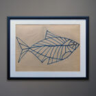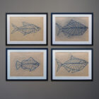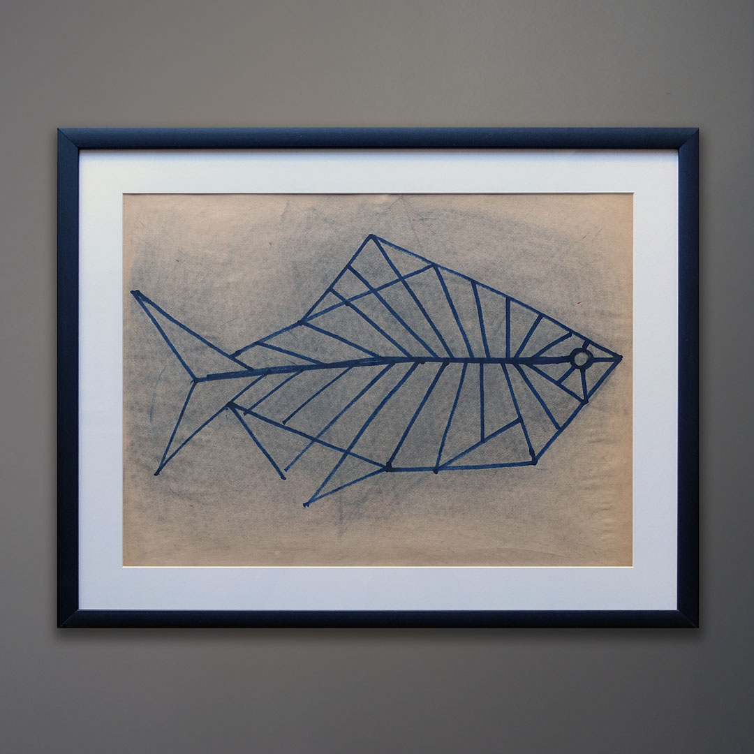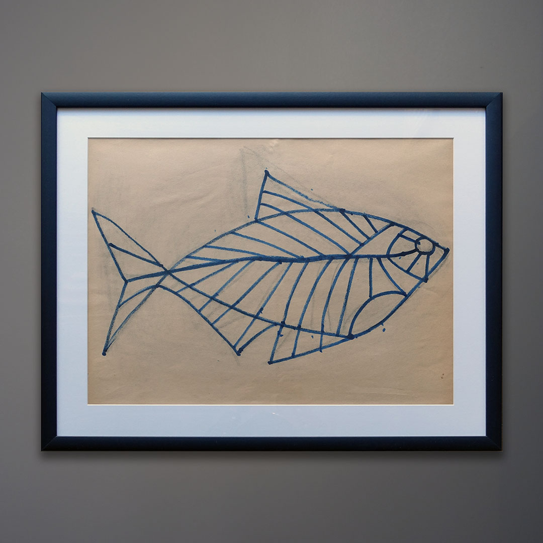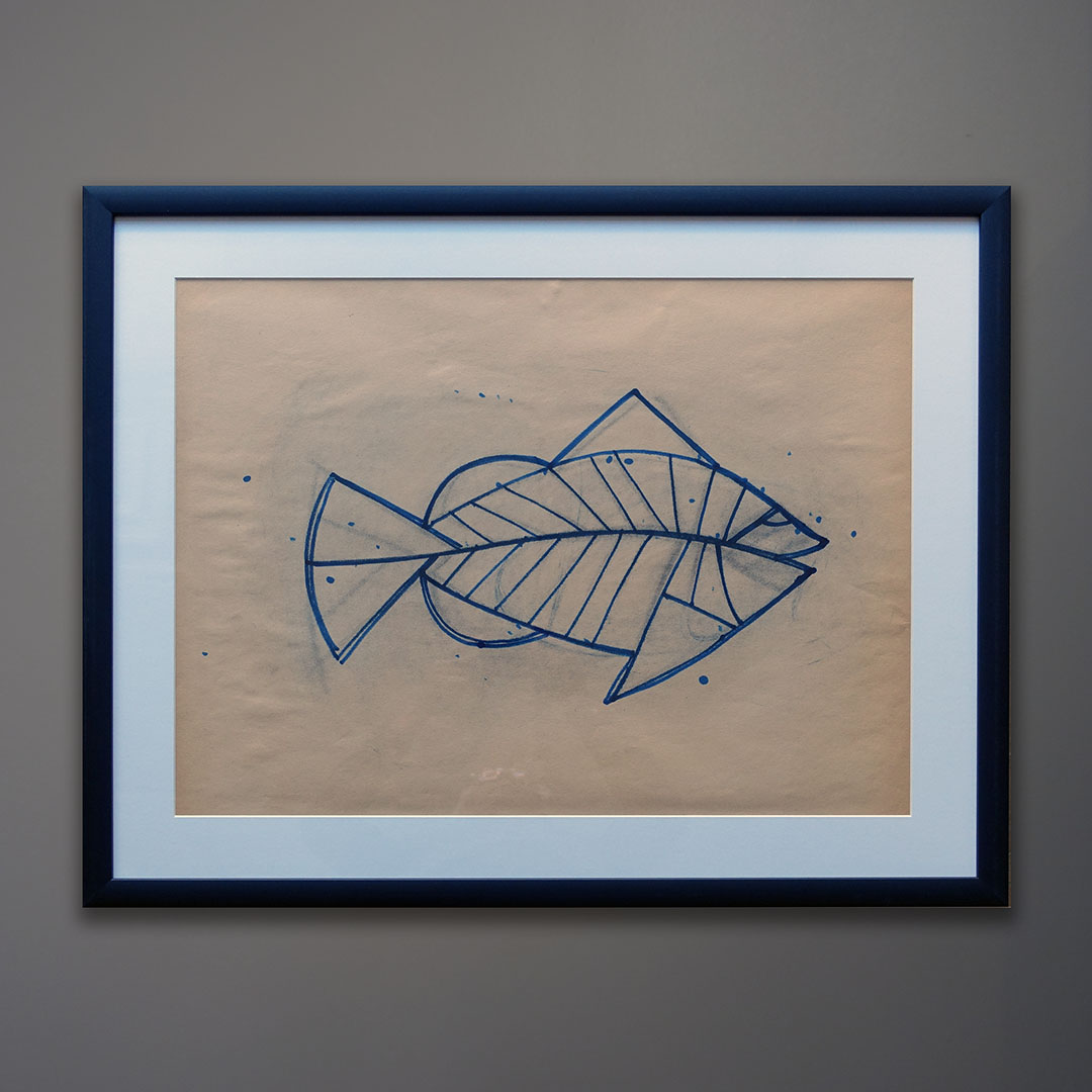 Four Mid-Century Modern works on paper by Allen Edward Kubach. Circa 1960s – 1970s. These works are blue Magic Marker drawing on newsprint. They are from a collection of works on paper we acquired after the passing of Kubach. These are the original drawings that measure 18 × 24 in a frame that measures 24 × 30 inches. As arranged in a group of four, with adequate spacing, the overall dimension is 51 × 63 — perfect for a large wall such as over a couch or over a bed. Priced as a set of four.