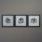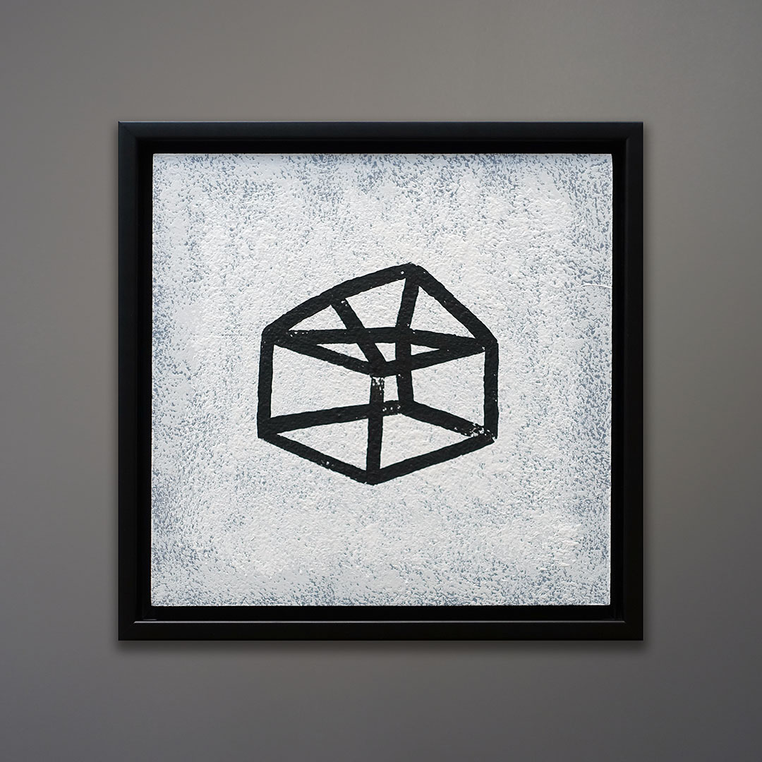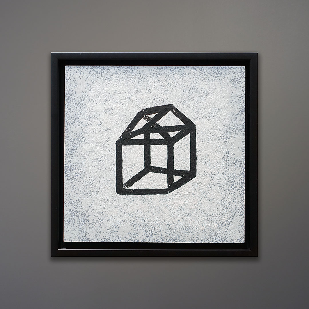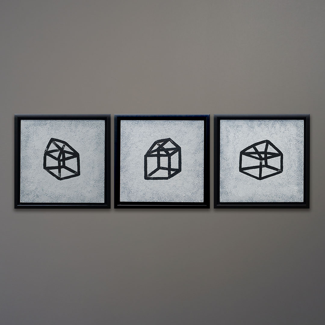 Offered here is a series of three original acrylic paintings by Michael Aron titled “Glass House, I, II, & II, 2020.” Each one measures 14 × 14 inches in a fine custom satin black wood float frame. As displayed horizontally with a 2 inch gap, the overall width is 14 × 46 inches: perfect for over a couch or bed. Sold as a set.