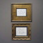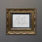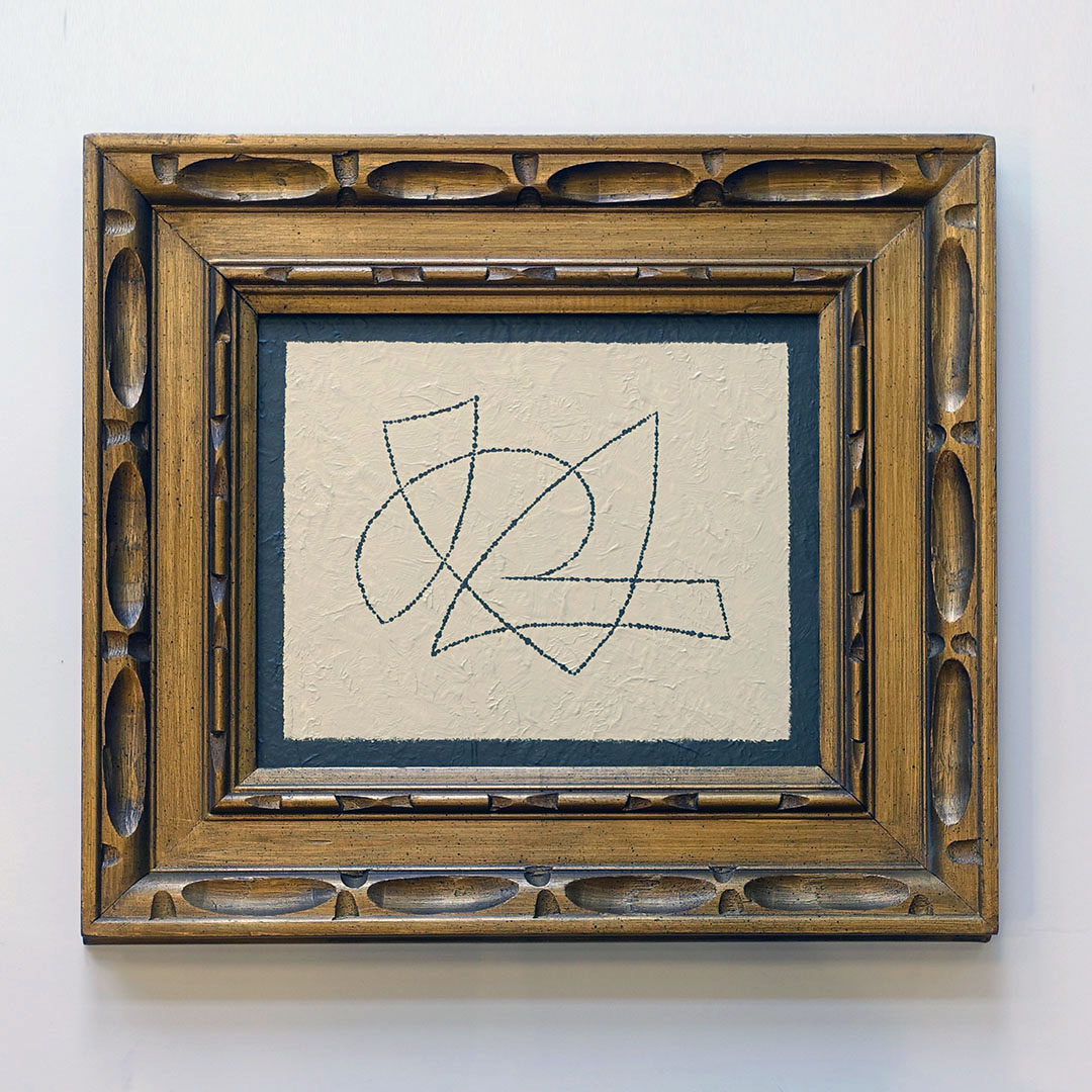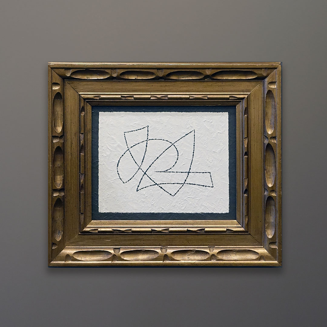 An original abstract painting by Michael Aron, 2020. Acrylic on masonite. 9 x 11 inches in a 16 x 18 inch vintage gold-tone heavily carved hardwood frame. Michael Aron studied art and design at the Wooster School in Ridgefield, CT; The Academy for Fine Art and Design in Genk, Belgium; Syracuse University; and got his BFA from the Cooper Union for the Advancement of Science and Art in NYC. He lives in Brooklyn and Greenport and is the proprietor of Ray New York.