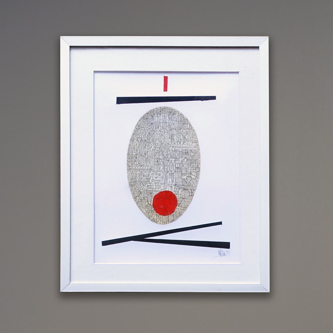 Offered here is an original mixed media abstract drawing on paper by Moya Aiken. 8¾ × 10½ inches as framed in matte silver aluminum. This drawing is part of a series as seen on this website. Each drawing is sold individually. Signed and dated 2019.