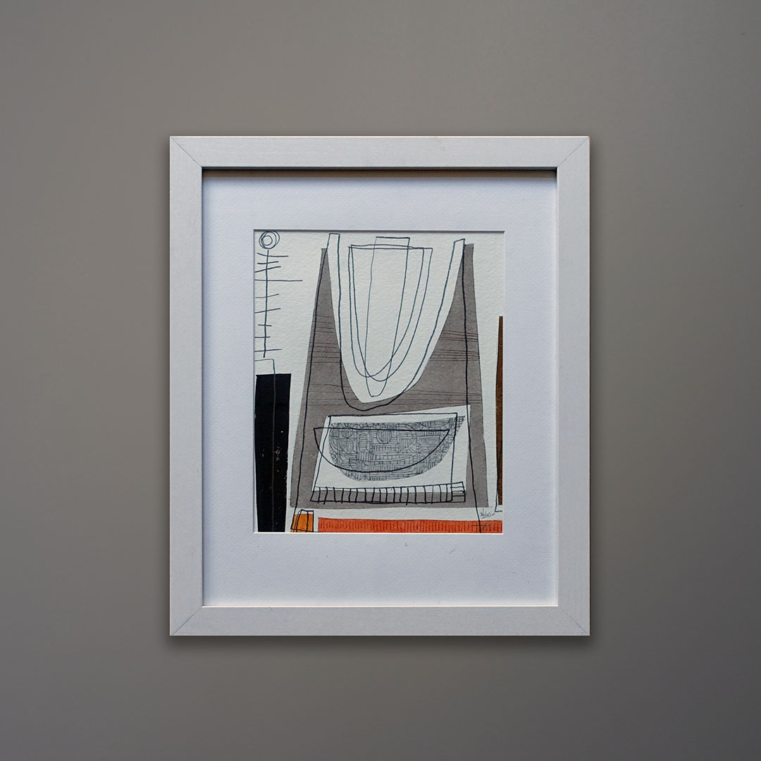 Offered here is an original mixed media abstract drawing on paper by Moya Aiken. 13 × 16 inches as framed in white laminated wood. This drawing is part of a series as seen on this website. Each drawing is sold individually. Signed and dated 2020.