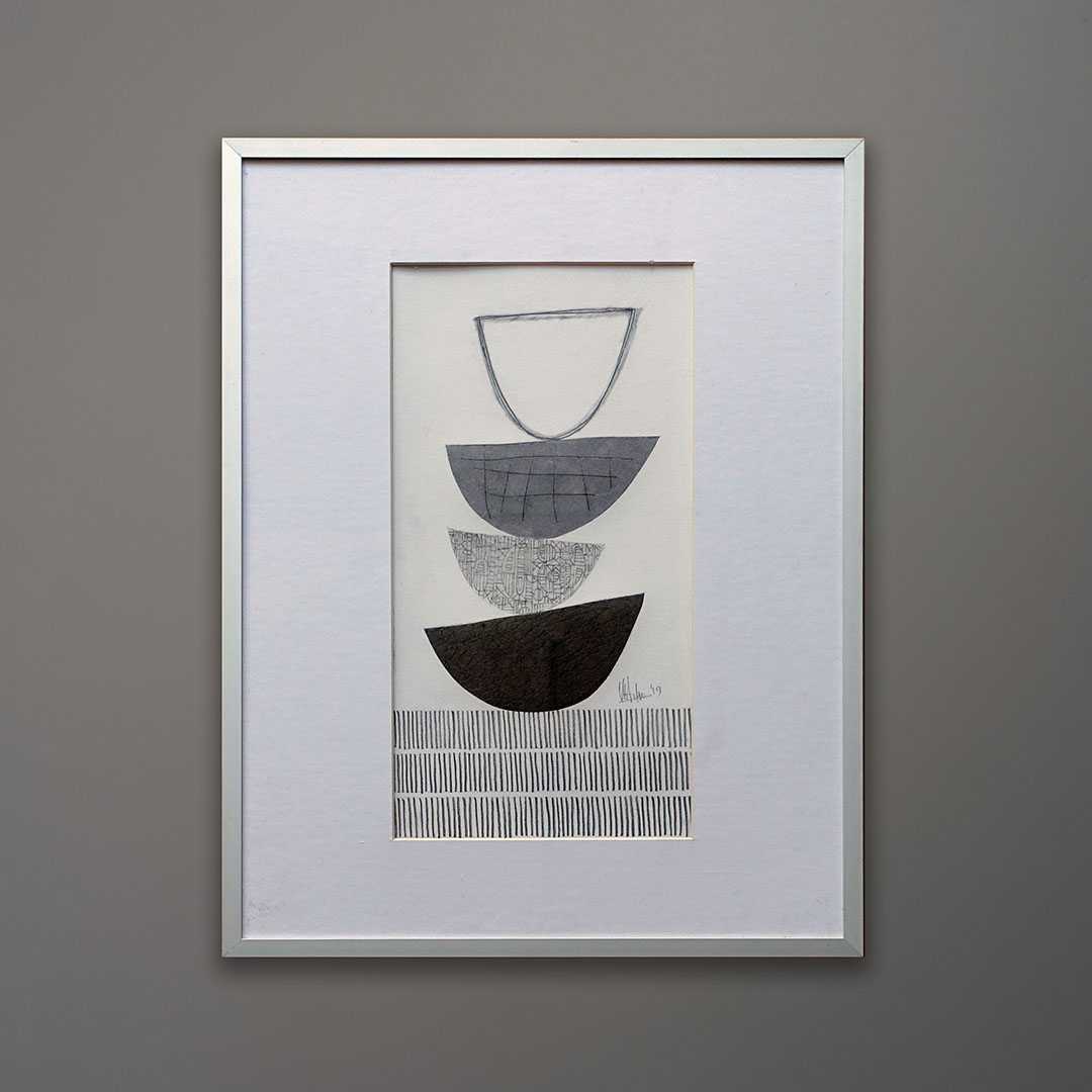 Offered here is an original mixed media abstract drawing on paper by Moya Aiken. 12½ × 16½ inches as framed in matte silver aluminum. This drawing is part of a series as seen on this website. Each drawing is sold individually. Signed and dated 2019.