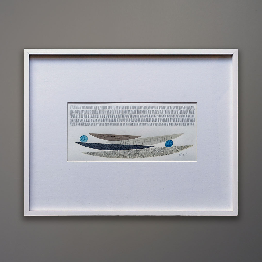 Offered here is an original mixed media abstract drawing on paper by Moya Aiken. 20 × 16 horizontal as framed in white laminated wood. This drawing is part of a series as seen on this website. Each drawing is sold individually. Signed and dated 2019.