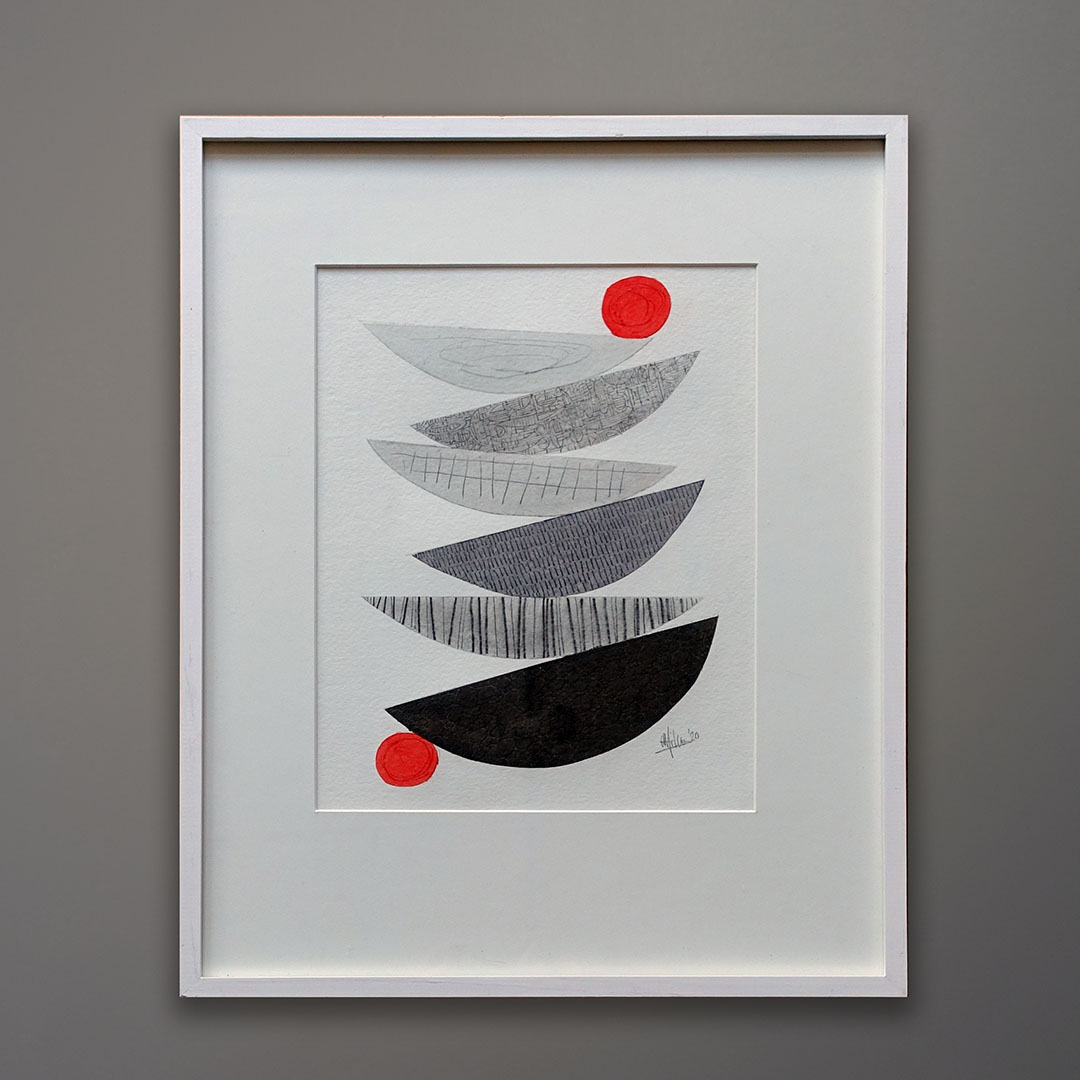 Offered here is an original mixed media abstract drawing on paper by Moya Aiken. 16 × 20 inches as framed in white laminated wood. This drawing is part of a series as seen on this website. Each drawing is sold individually. Signed and dated 2020.