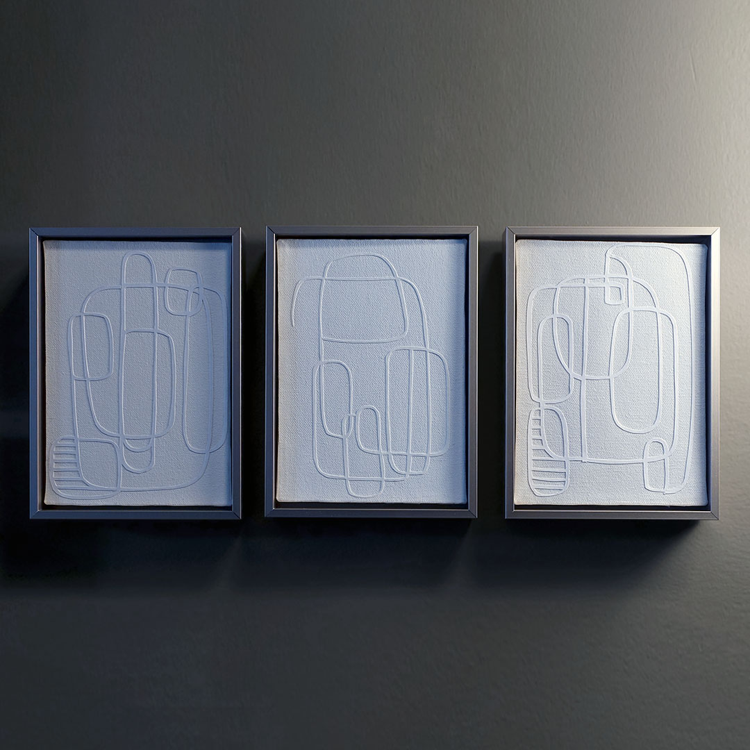 Offered here is an original mixed media abstract collage on stretched canvas by Moya Aiken. Each piece individually is 5 × 7 inches as float framed in champagne tinted aluminum. The group of three as shown here is 16 × 7 inches. Sold as a group of three. Signed and dated 2019 on the verso.