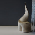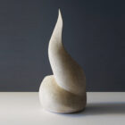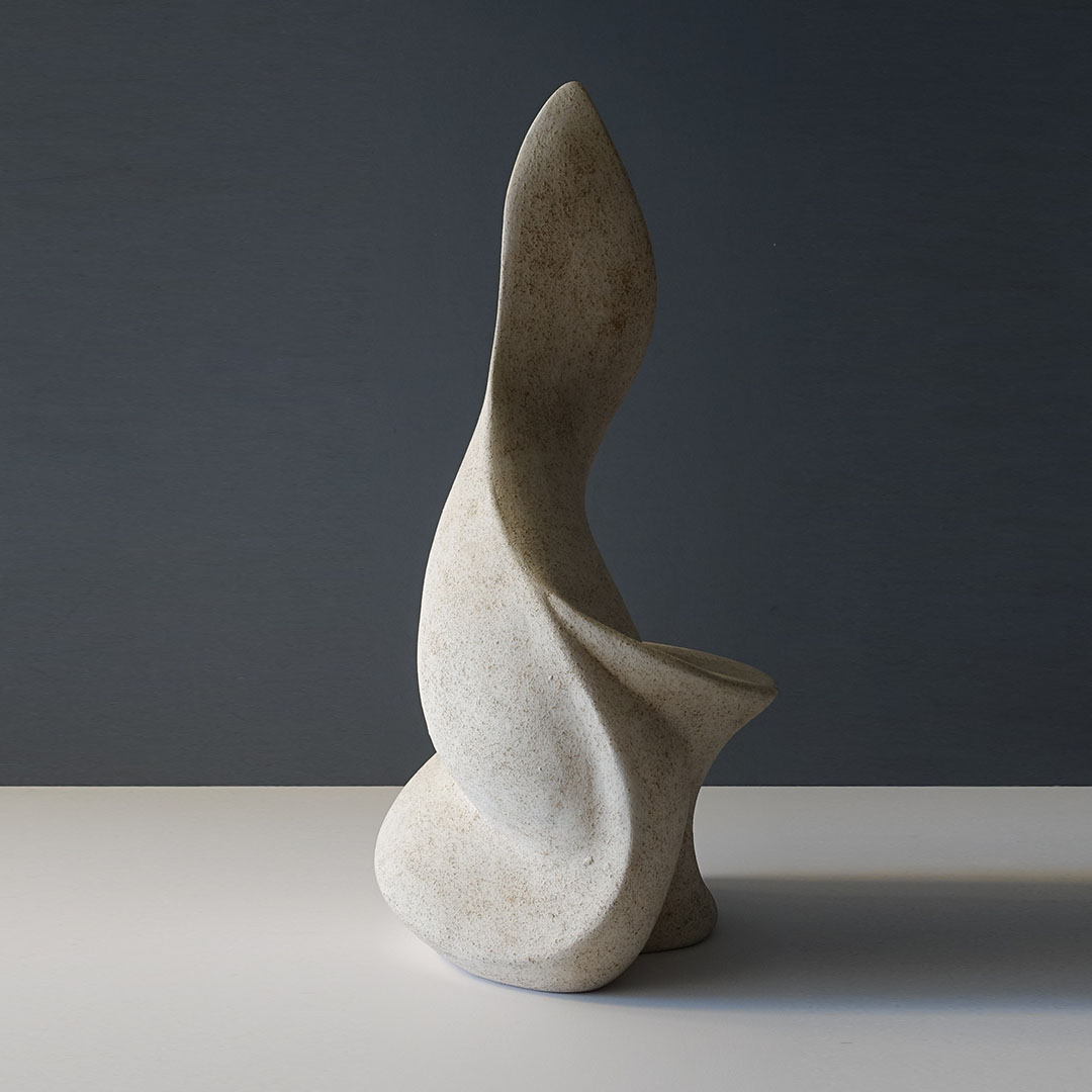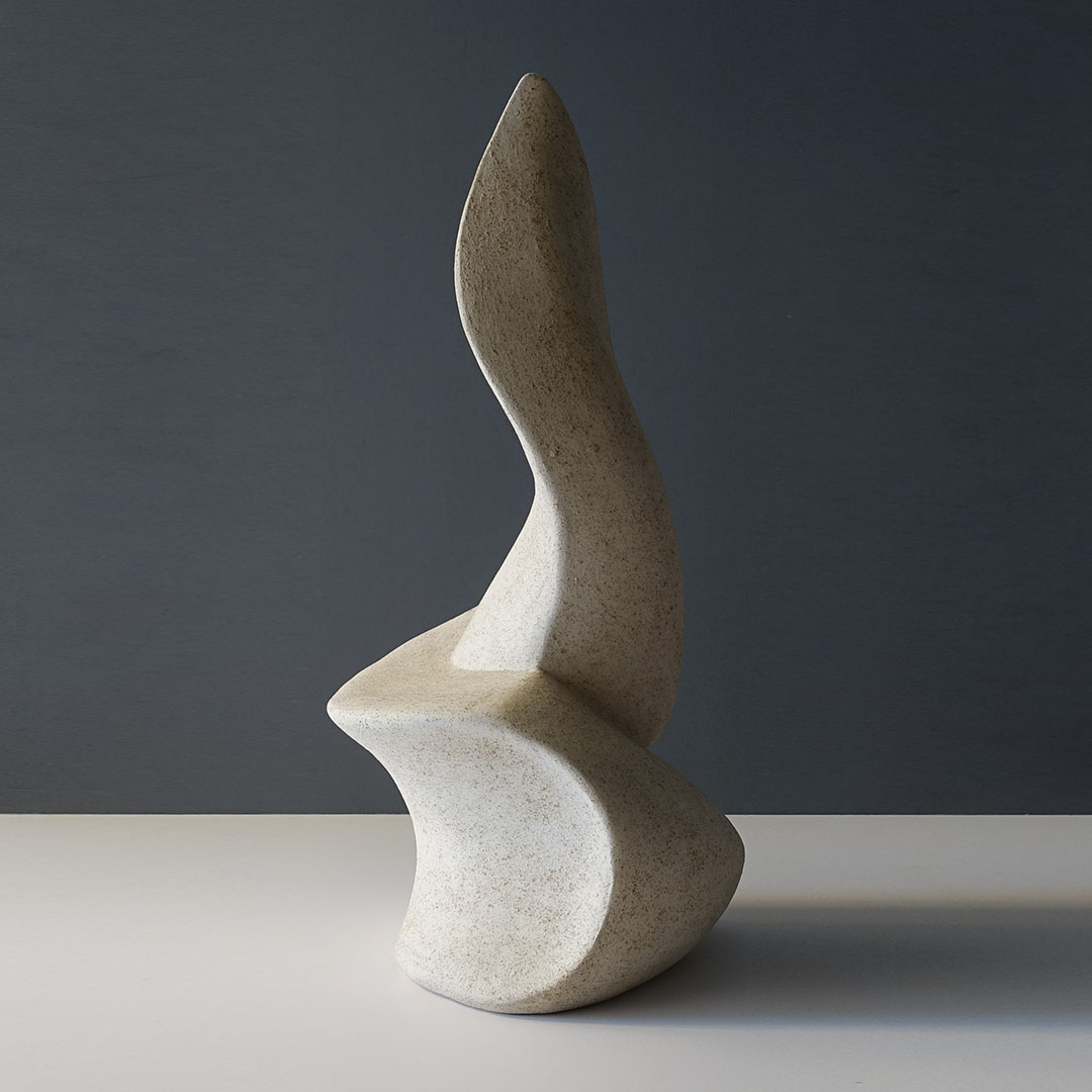 A very fine ceramic abstract sculpture offered here. It stands almost 20 inches tall. It is signed by a mystery artist Joanne L.L.W. and dated 7/91. It is a hollow form glazed to resemble stone. The color is a neutral beige white.