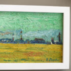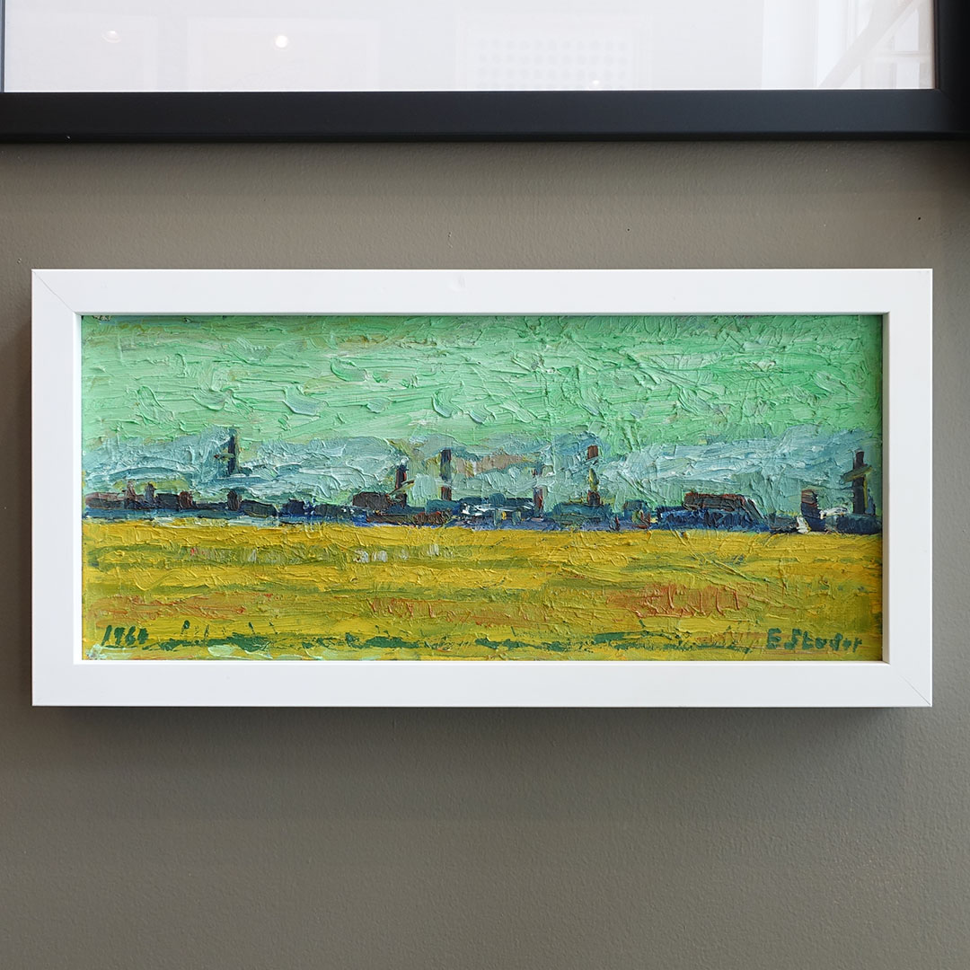 We love brushwork like this, not to mention a bright green sky. A pastoral landscape featuring an unknown skyline. Dated 1964 and signed E. Studer. Purchased at an estate sale in Connecticut. No other information is available about this artist. Yet.
