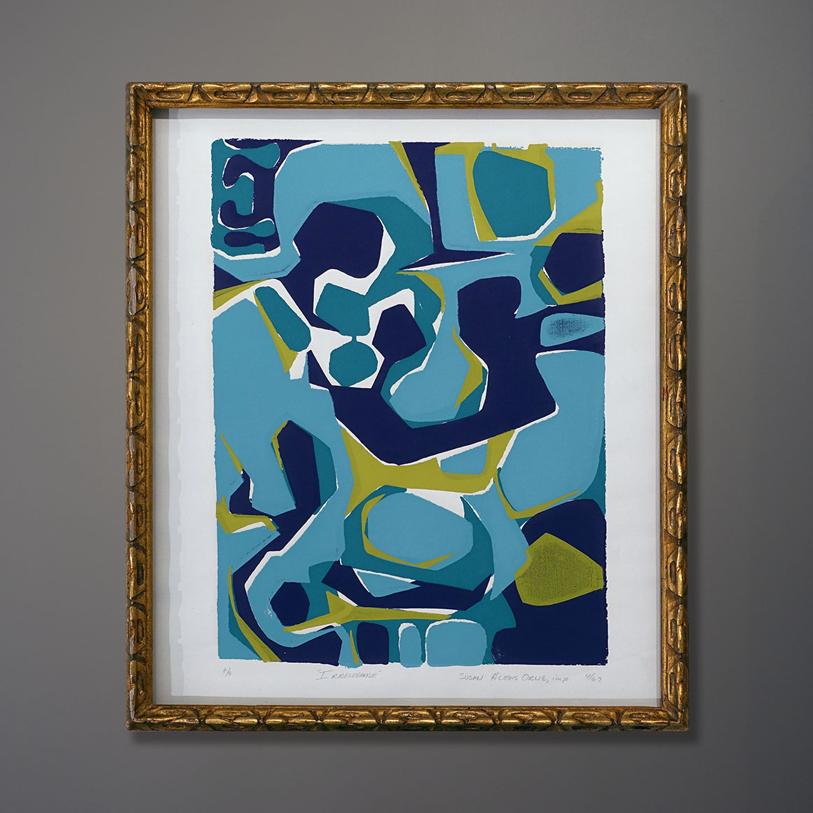 Energetic organic overlapping shapes in rich ink on 100% cotton Strathmore. S. A. Orlie created this work in 1967 while attending the prestigious Pratt Institute. She is a local artist residing here in Greenport, NY. The serigraph is 13 x 18 inches, numbered, signed, and dated. It is print #8 out of an edition of 9. The title is “Irrelevance.” Vintage hand carved gold leaf hardwood frame with gallery quality acrylic face. 19 x 23 inches framed size.