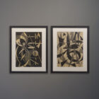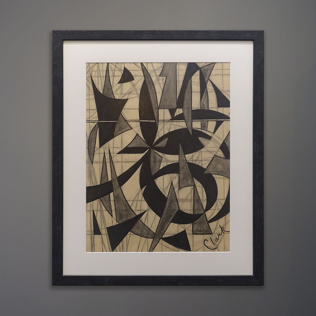 Vigorous line work and well composed geometric shapes make this piece stand out. It is part of a matched pair of drawings that look great together in a diptych. It is signed on the front, and on the verso, and titled and dated on the verso “Grasses, NFS, Fall, 1991.” We do not have biographical information about this artist yet. The overall framed size is 24 x 30 inches. Charcoal on paper.