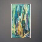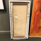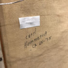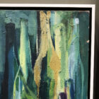 A terrific impressionistic oil painting of a group of wine bottle shaped vessels. Thick impasto brushwork. Signed or marked on the back “Caryl Hammerich 1965 – 1975.” We removed it from its original frame and float mounted it in a new whitewashed hardwood frame with a black interior. This did reveal some missing paint along the edge that had been previously covered by the frame. Additionally there is a one-inch slit in the painting midsection that was repaired lightly with acid free linen tape. It looks fine. 15 × 32 inches.