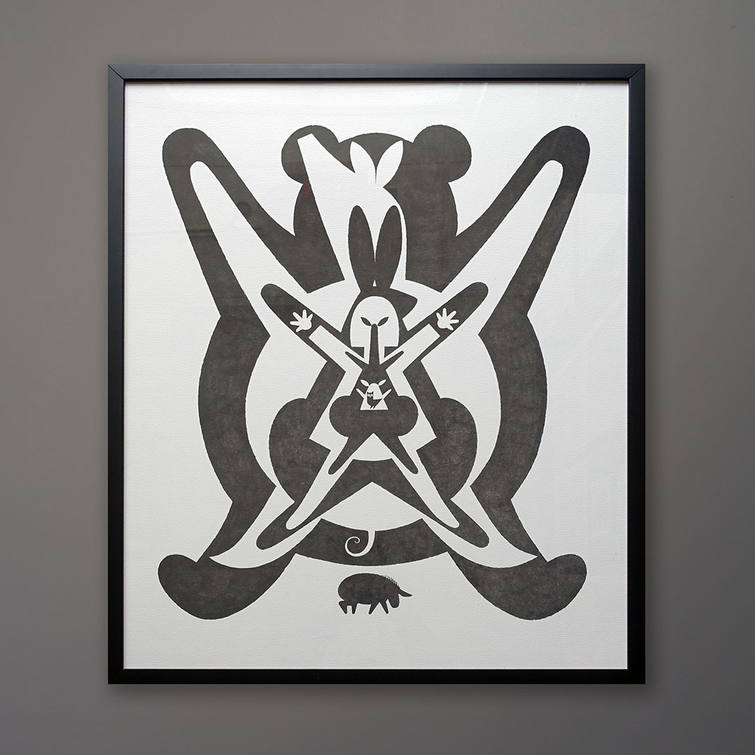 Eladio López created this ingenious ink drawing in the 1960s for his young daughter Nola. Archival pigment print on matte paper; 25 × 32 inches framed size; other sizes and colors available. The characters top to bottom: Winnie-the-Pooh, Piglet, Rabbit, Christopher Robin, Kanga, Roo, Owl, Eeyore.