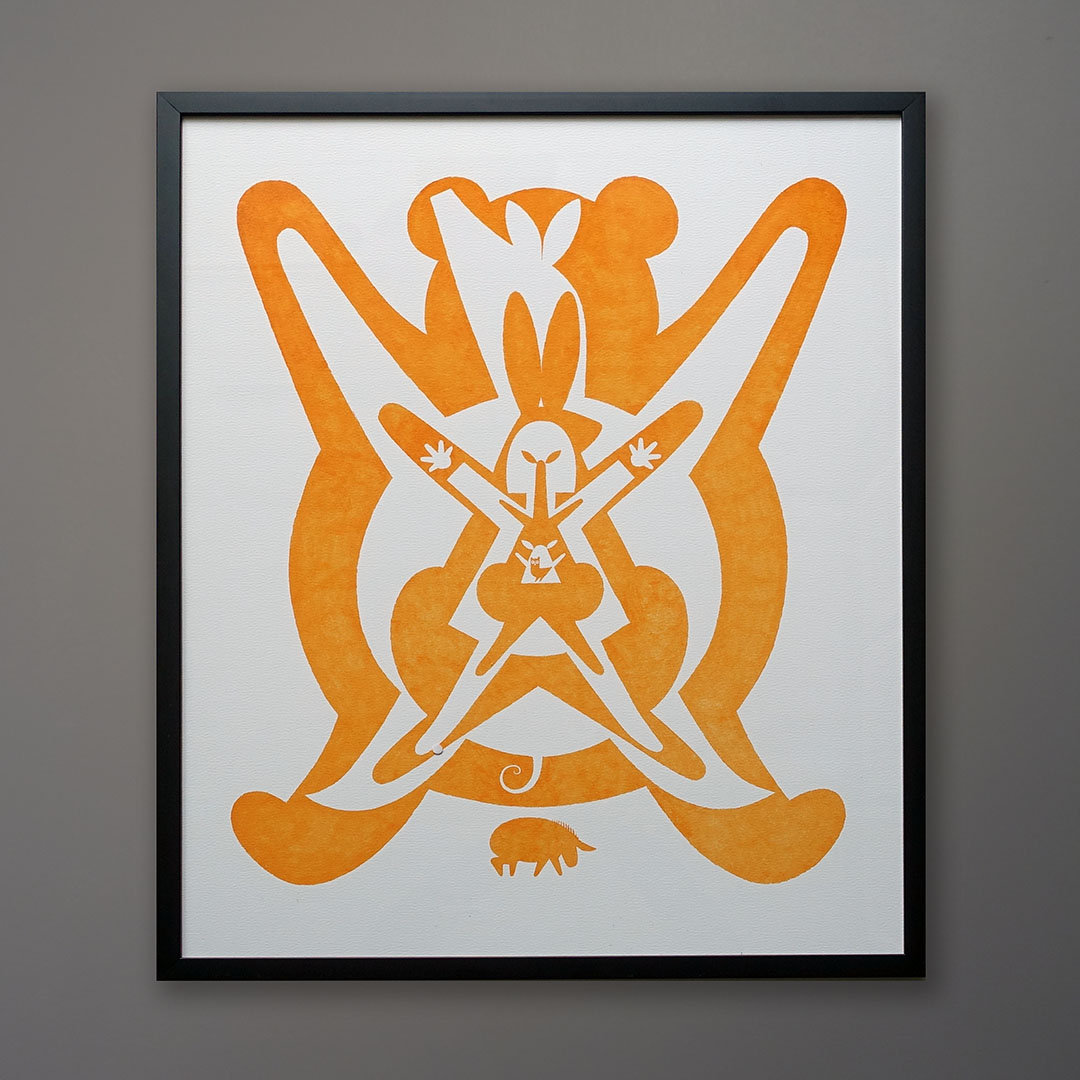 Eladio López created this ingenious ink drawing in the 1960s for his young daughter Nola. Archival pigment print on matte paper; 25 × 32 inches framed size; other sizes and colors available. The characters top to bottom: Winnie-the-Pooh, Piglet, Rabbit, Christopher Robin, Kanga, Roo, Owl, Eeyore.