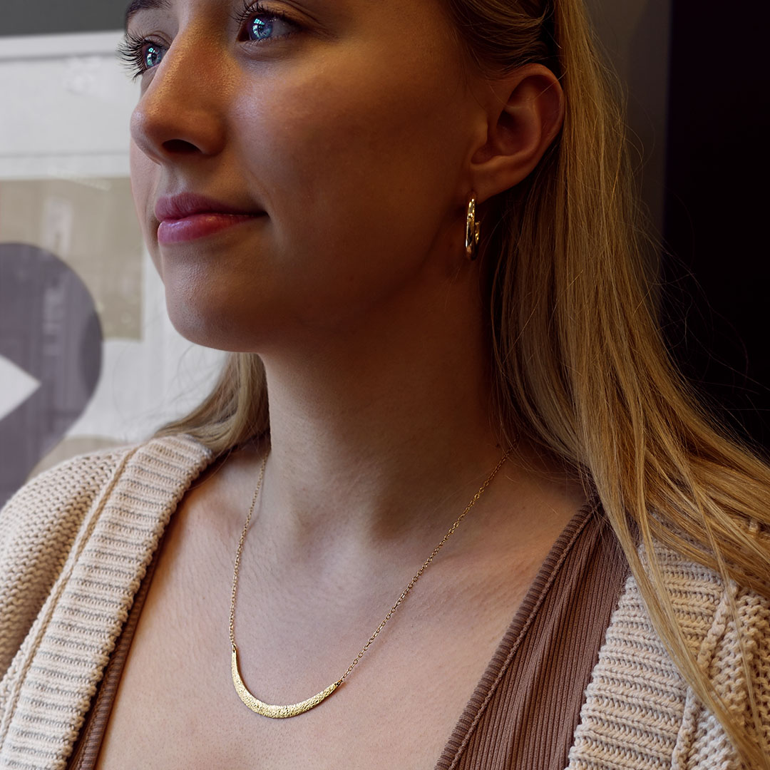 Made in 2020 by Kate Eickelberg, Oakland, CA. 18k yellow gold. 18 inches long. This necklace is cast with the texture of Northern California beach sand. The recesses in this texture are matte, while the raised parts are shiny, giving you a subtle sparkle.