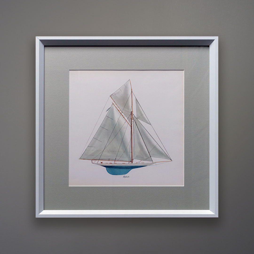 20 x 20 inches framed litho of the racing yacht “Defender.” 1895 – NINTH America’s Cup DEFENSE