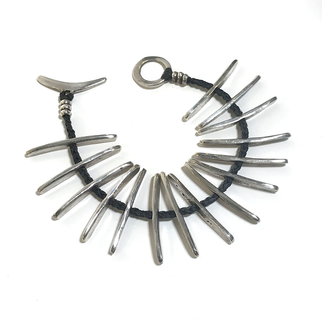 Jill Platner designed and made this modernist sculptural bracelet in the early 2000s. The design has been retired. It has never been worn. A similar design, “Beaming”, is available in her NYC shop for $1,925. Solid sterling silver crocheted in a 7 inch bracelet with a toggle clasp. It is meant to fit snugly. Signed.