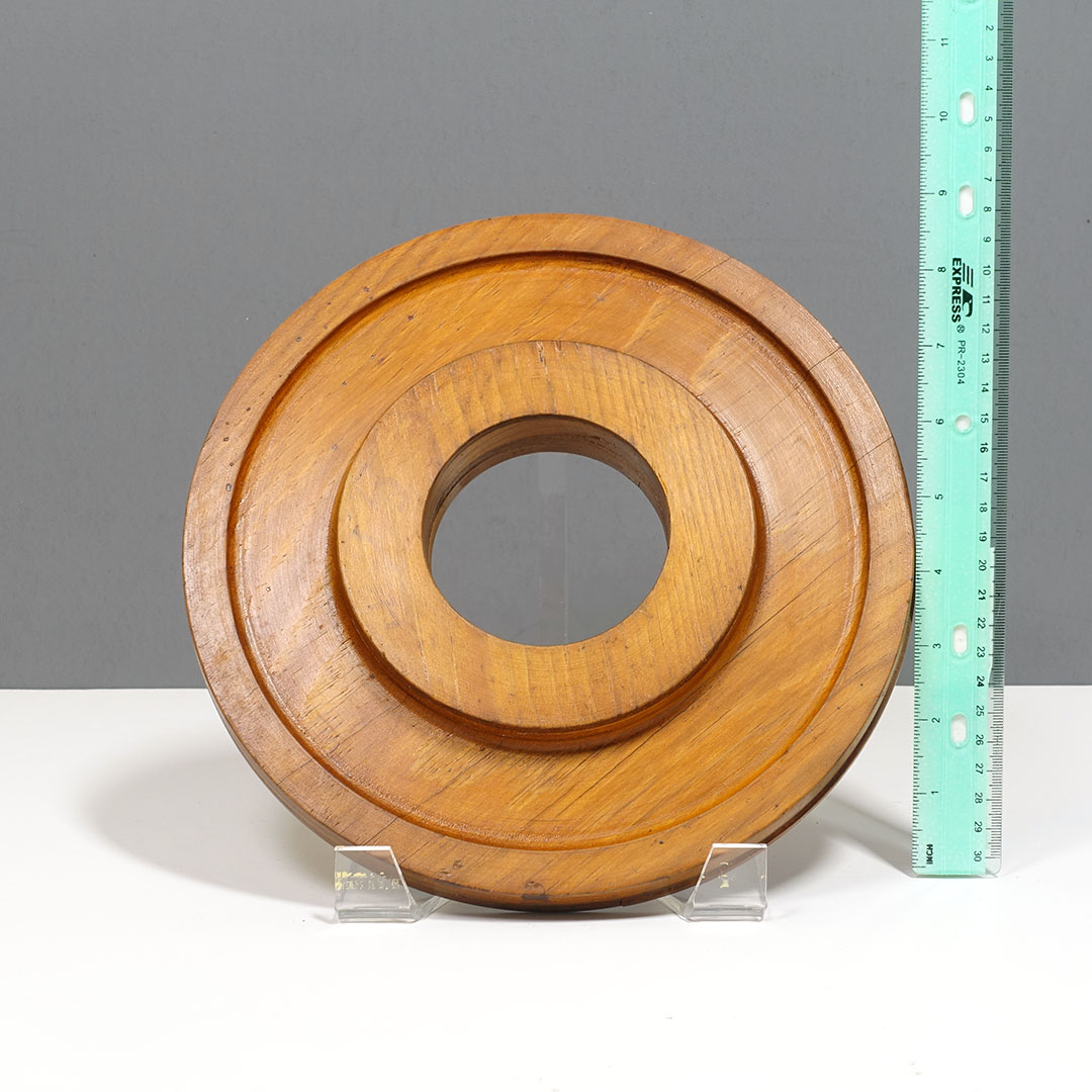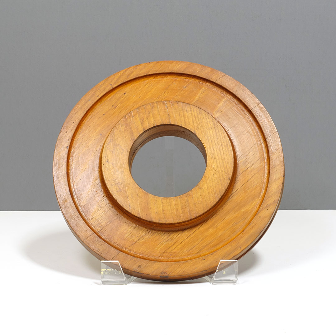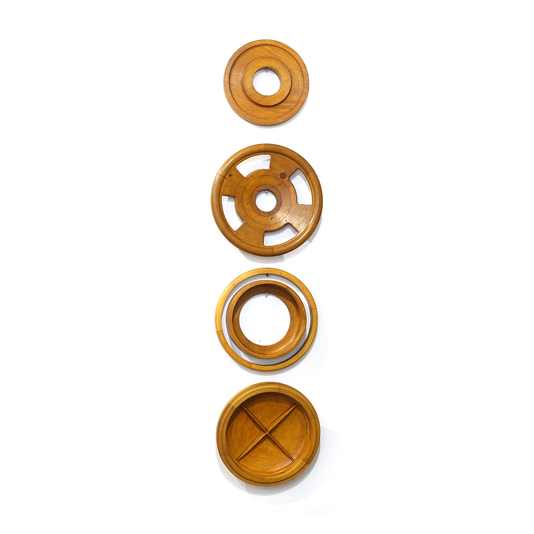 Offered here is a set of five antique foundry molds arranged as wall sculpture entitled “Found Round” by Michael Aron 2020. Machine Age wooden foundry molds (1877-1920) are carved to form negative space for metal casting with handles to hold during production. The mold is pressed into sand, removed, then molten metal is poured into the resulting void. Hangs horizontally or vertically with a total width of 66 inches.