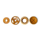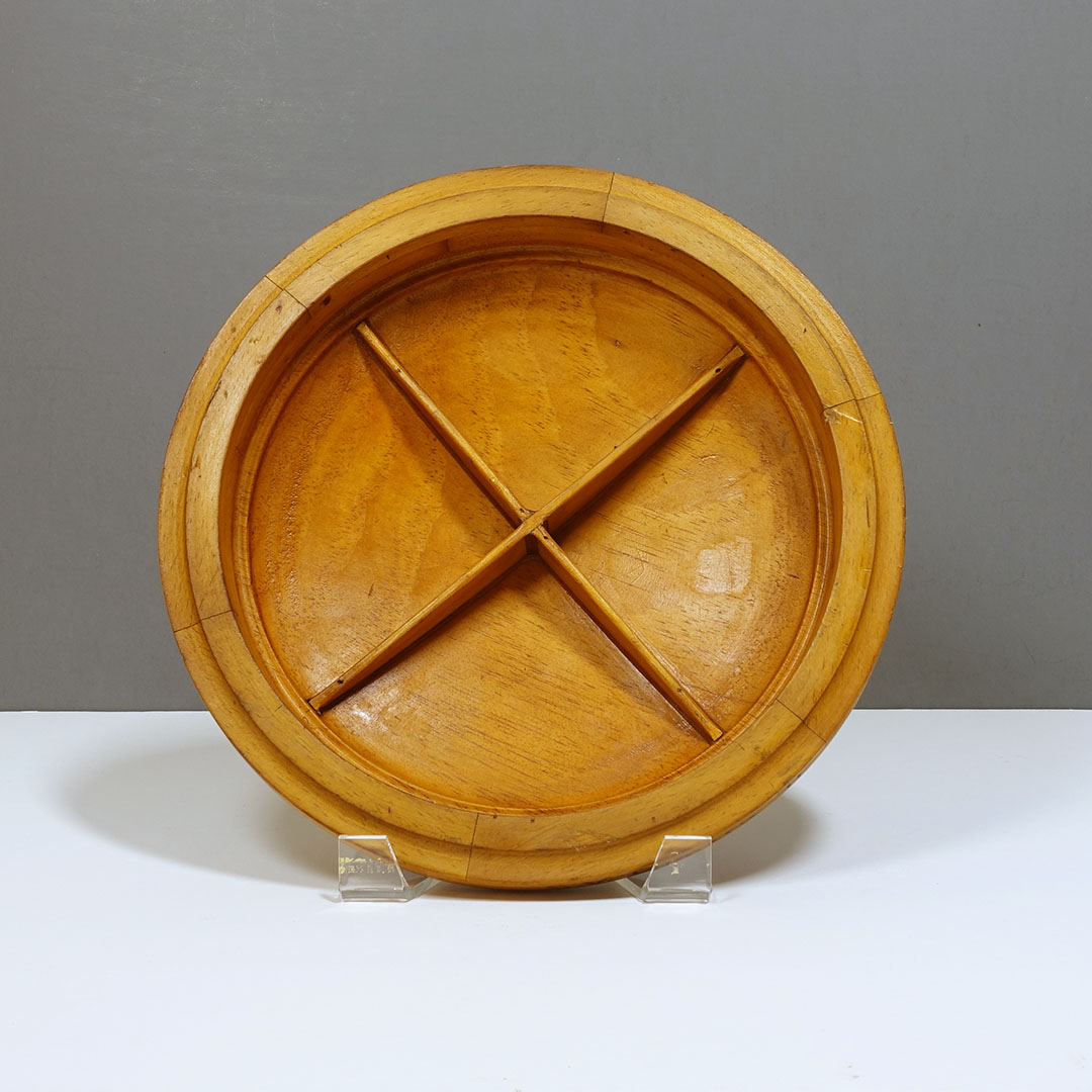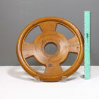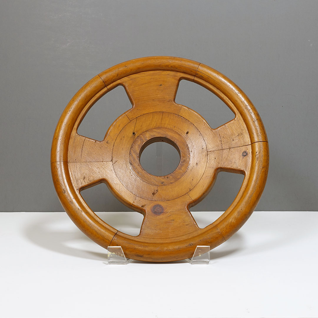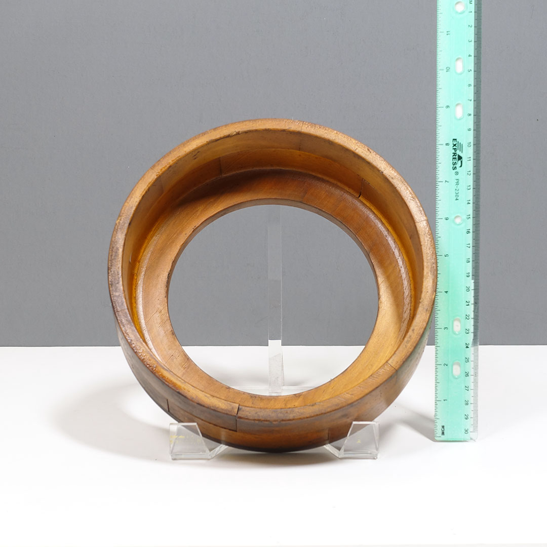 Offered here is a set of five antique foundry molds arranged as wall sculpture entitled “Found Round” by Michael Aron 2020. Machine Age wooden foundry molds (1877-1920) are carved to form negative space for metal casting with handles to hold during production. The mold is pressed into sand, removed, then molten metal is poured into the resulting void. Hangs horizontally or vertically with a total width of 66 inches.