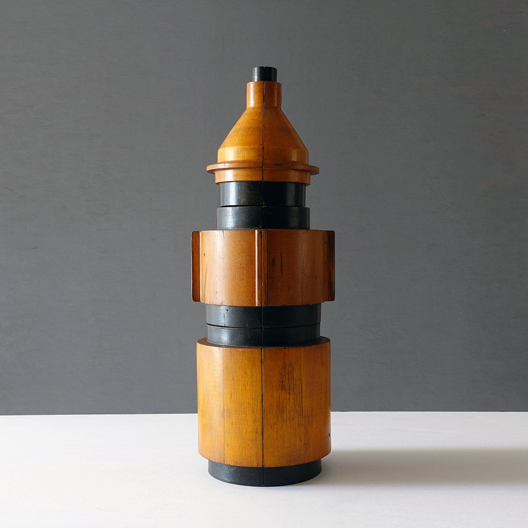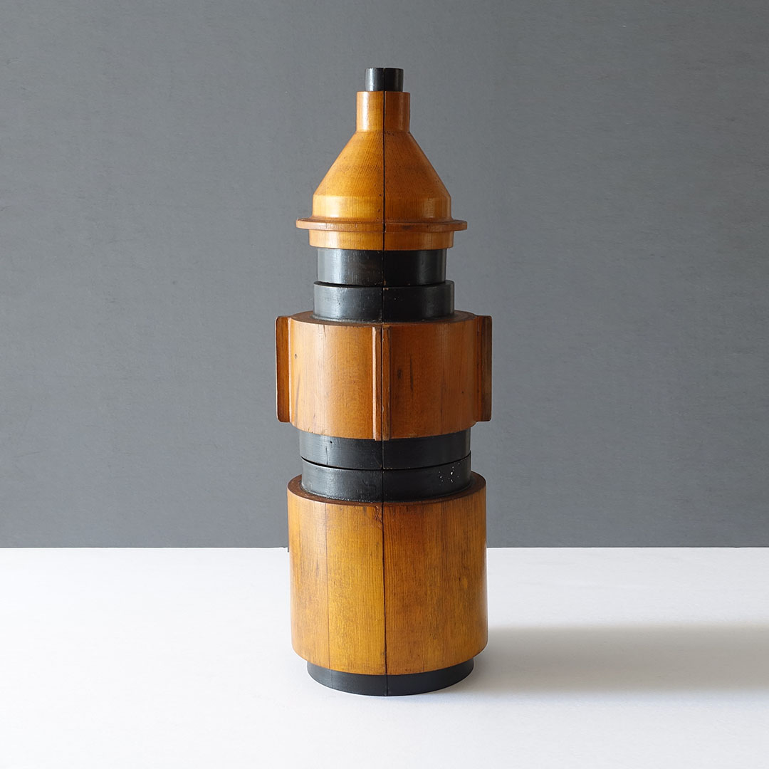 Machine Age wooden foundry molds (1877-1920) are carved to form negative space for metal casting with handles to hold during production. The mold is pressed into sand, removed, then molten metal is poured into the resulting void. The molds are painted to protect the wood.