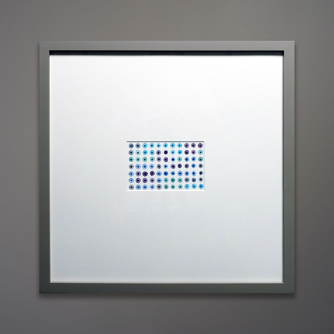 This artwork is distinctive because of the way the pattern responds to the viewer’s eye. A sense of movement, an awareness of the near-perfect but also not-perfect design. An original watercolor painting on heavy watercolor paper. It is framed in warm gray hardwood and has a museum glass face.