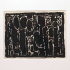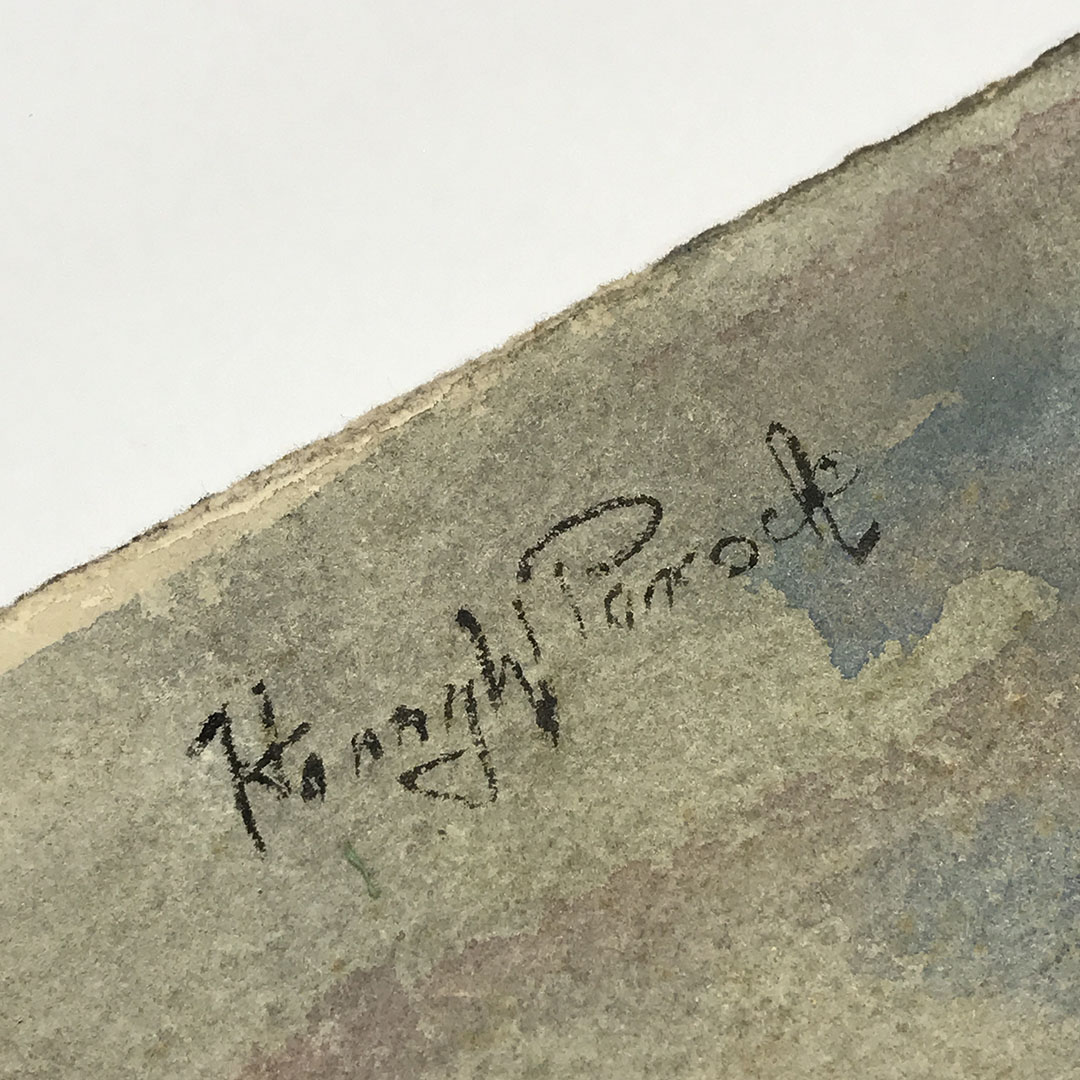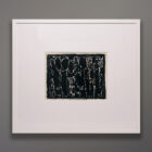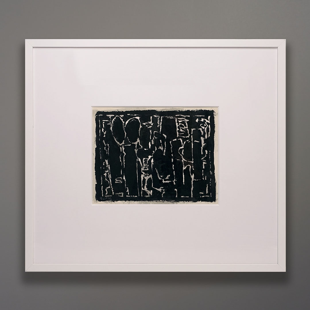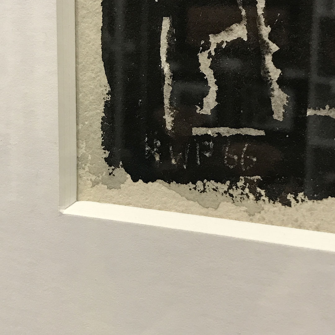 This is a great piece. It features black watercolor or gouache on heavy handmade paper with a linear pattern. Signed on the bottom left HWP 66. The back of this artwork is another painting by the same artist with a somewhat legible signature. We think it says Harry W. Peacock. We framed it in a generous 8-ply mat and a simple flat white wood molding. Overall dimension is 27 x 24 inches.