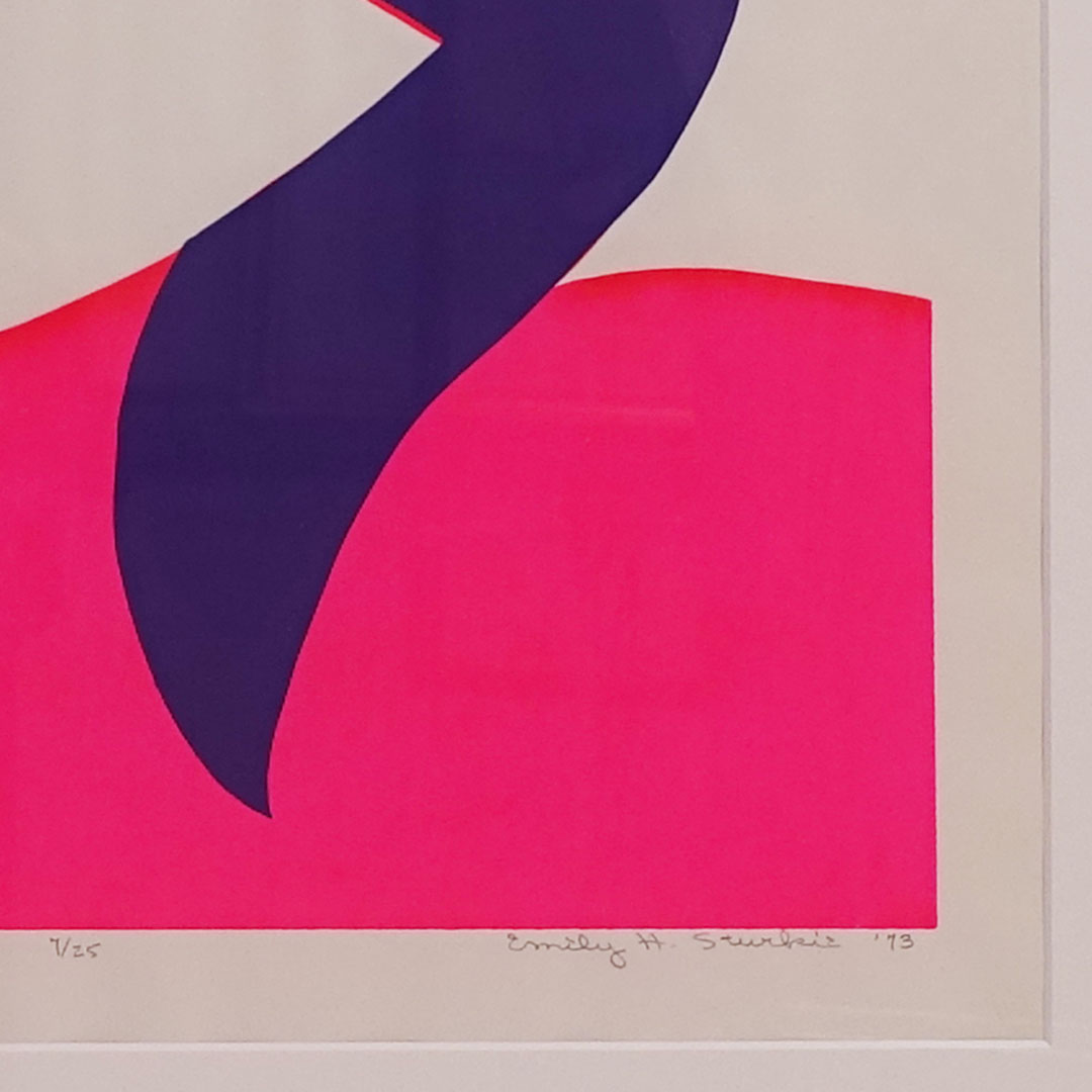 Offered here is an original limited edition Pop Art serigraph by Shelter Island, NY artist Emily H. Sturkie. The overall dimension is 27 x 27 inches. Silkscreen print in two fluorescent “Day-Glo®” colors on white art paper. Titled, numbered 7/25, signed, and dated 1973 in pencil.