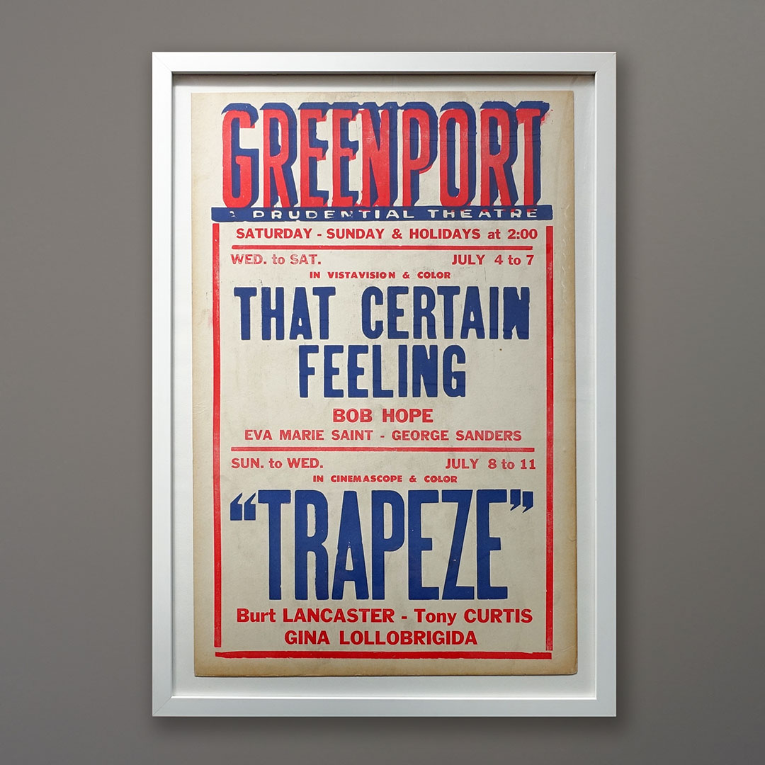 Offered here is the original vernacular typography poster for the July 4th, 1956 showing of “That Certain Feeling” with Bob Hope and Eva Marie Saint. And, the following week, “Trapeze” with Burt Lancaster, Tony Curtis, and Gina Lollobrigida. Wow. 18 x 26 inches as framed in white wood.