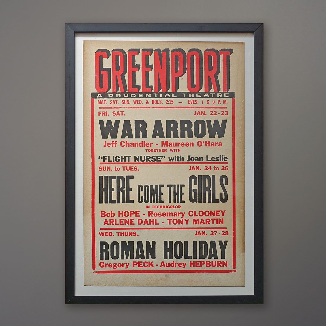 Offered here is the original vernacular typography poster for the 1953 showing of “War Arrow” with Maureen O’Hara, “Here Come the Girls” with Bob Hope, and “Roman Holiday” with Gregory Peck and Audrey Hepburn. 18 x 26 inches as framed in black wood.