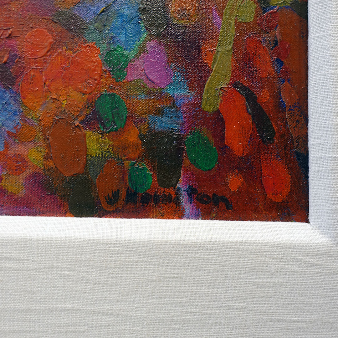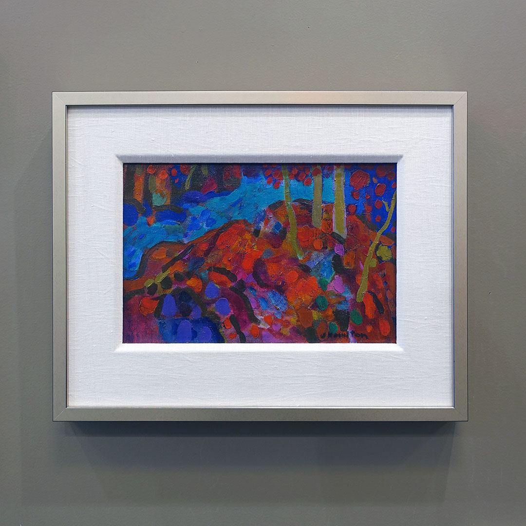 A vibrantly colorful impressionist landscape from the Mid-Century depicting a river through the woods. Signed by J. Hamilton, undated. Oil painting on canvas in a new silver finish wood frame with a linen liner. Overall dimension as framed is 18×22 inches. Painting is in excellent condition. We have no biographical information for this artist as of yet. This work comes from an important house in Southampton, New York.