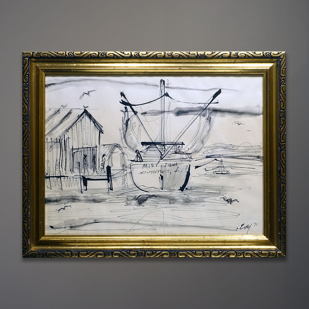 This drawing looks so much like the harbor here in Greenport, an historic maritime village that still has many active commercial fishing boats. Offered here is a fine ink drawing signed illegibly and dated 1971. It’s in a heavily carved gold leaf frame that measures about 12 x 16 inches.