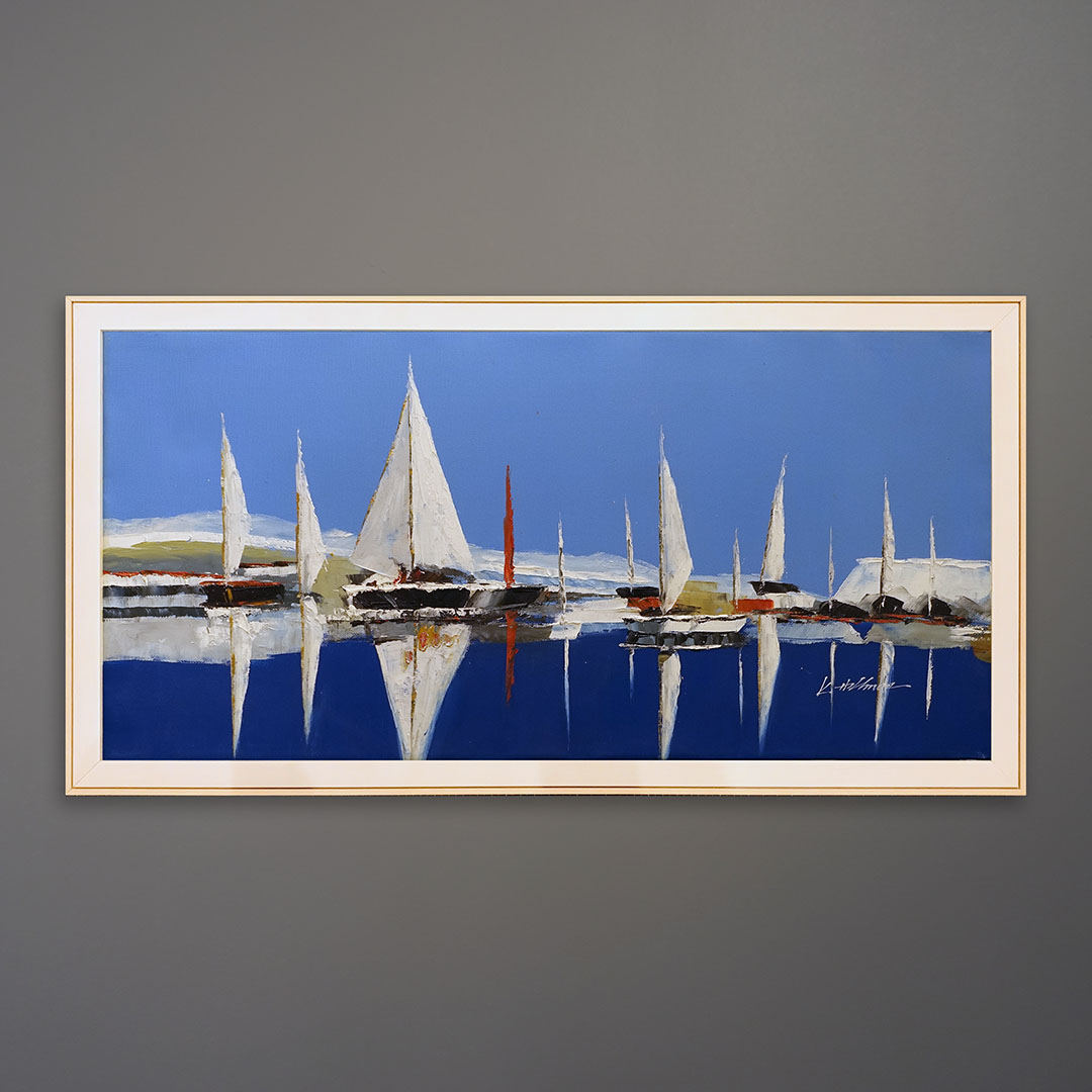 A really good acrylic on canvas painting of sailboats in a harbor with their sails reflected in the water. Signed K. Hillman. I do not have any biographical information on this artist. Many similar paintings have sold at auction over the years. Still doing the research.