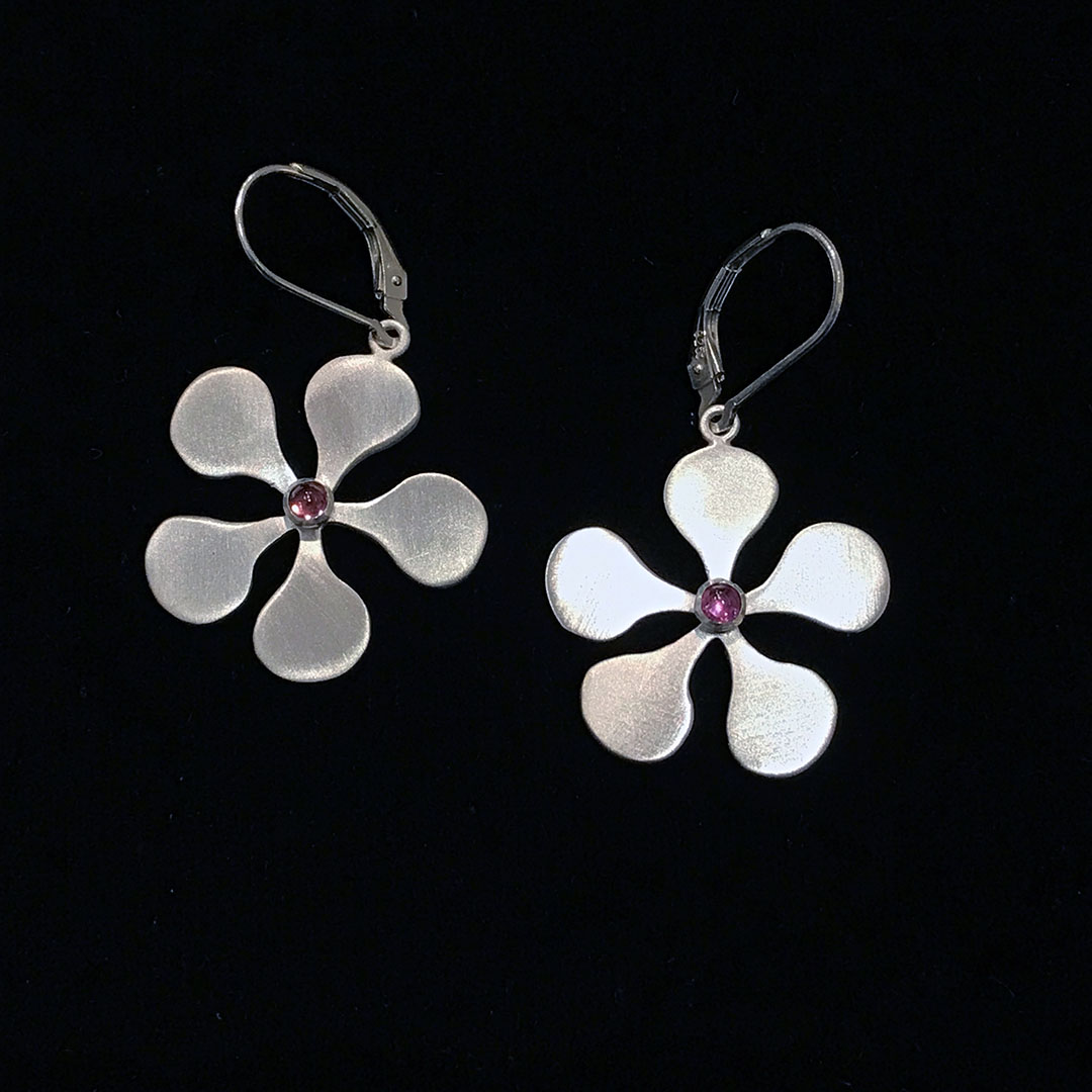 1960s mod style earrings by Meryl Waitz in .925 matte sterling silver with a 3mm rhodolite garnet cabochon in the center. Groovy.