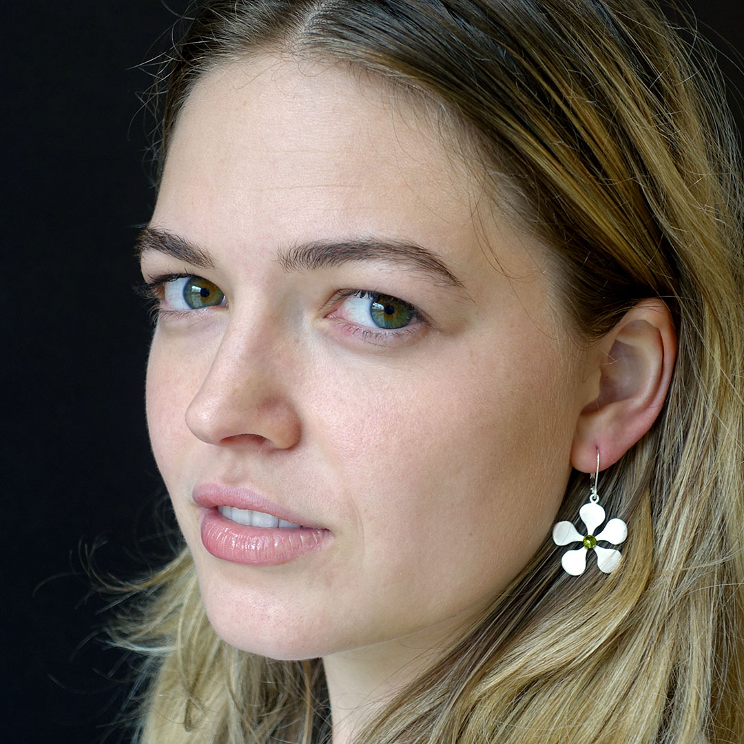 1960s mod style earrings by Meryl Waitz in .925 matte sterling silver with a 3mm peridot cabochon in the center. Groovy.