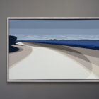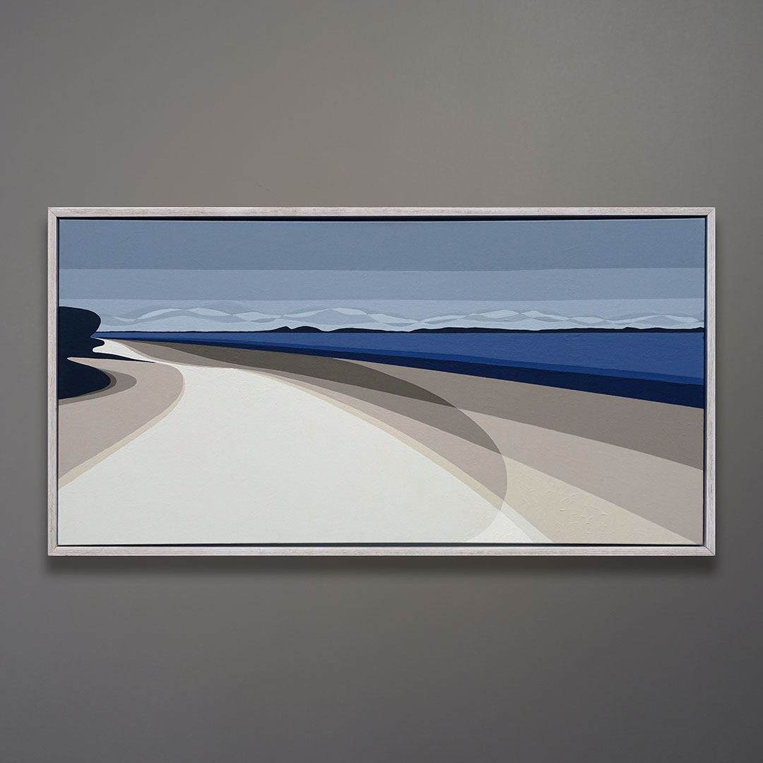 An original polymer painting on canvas by Michael Aron, 2021, titled “Orient III.” It depicts an abstracted view of Peters Neck Point and the Peconic River as seen from Orient Beach State Park in Orient New York, at the very tip of the North Fork of Long Island. A truly idyllic spot teeming with birds and wildlife. The overall size is 26 x 50 inches as float framed in whitewashed wood with a weathered barn siding-style grain.