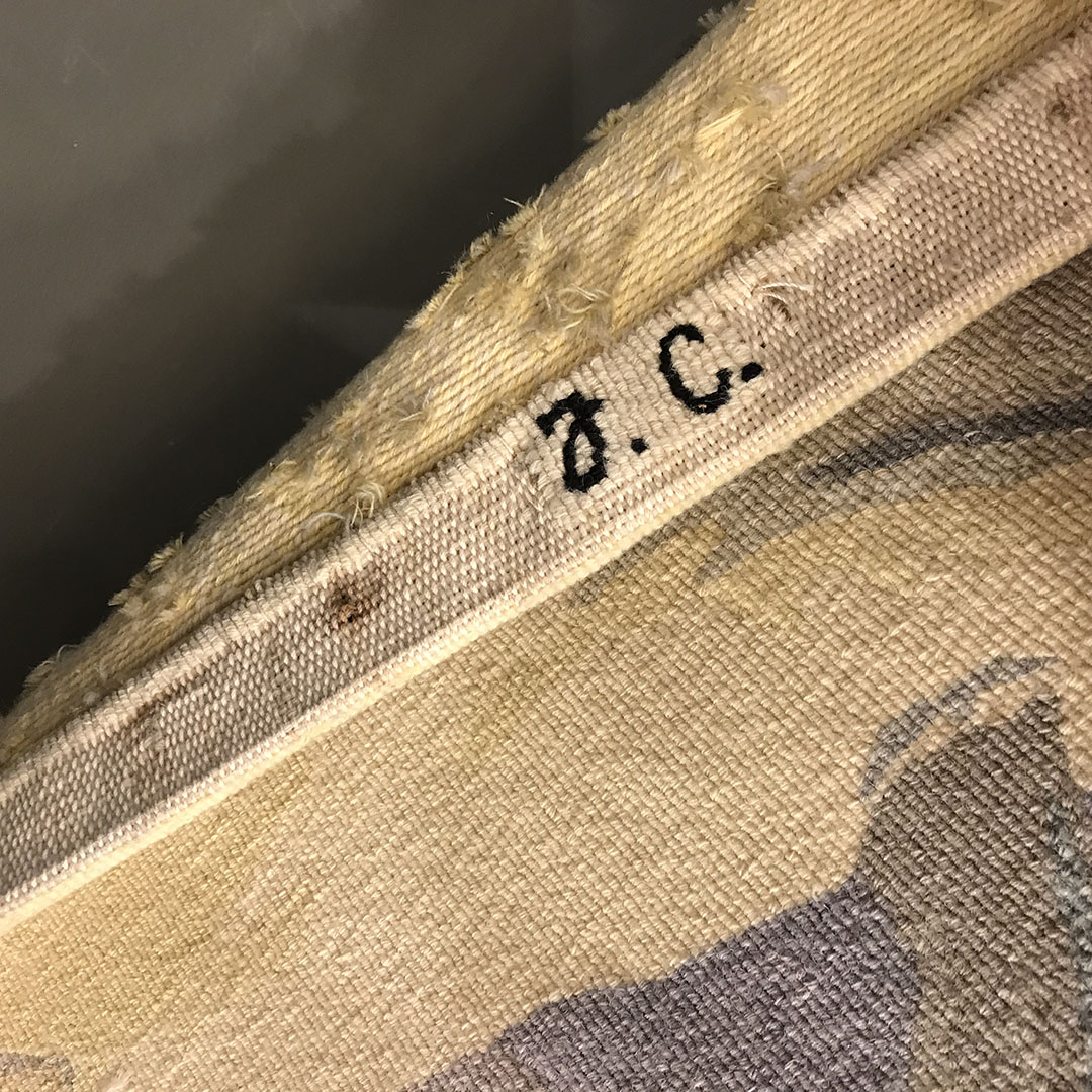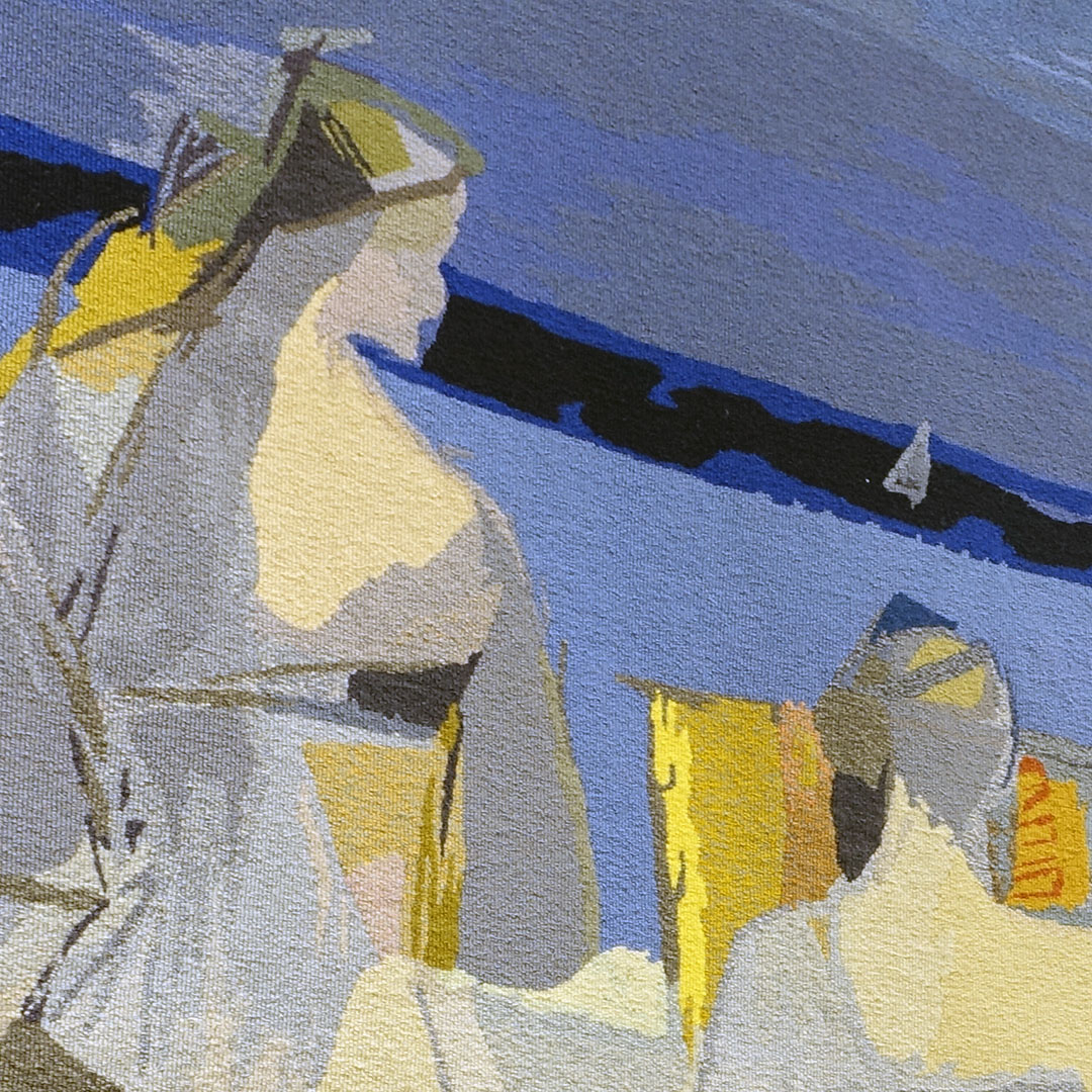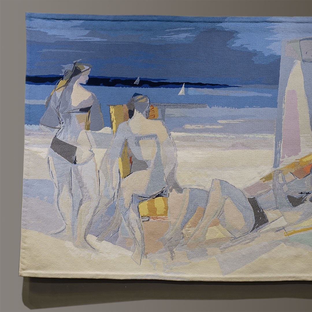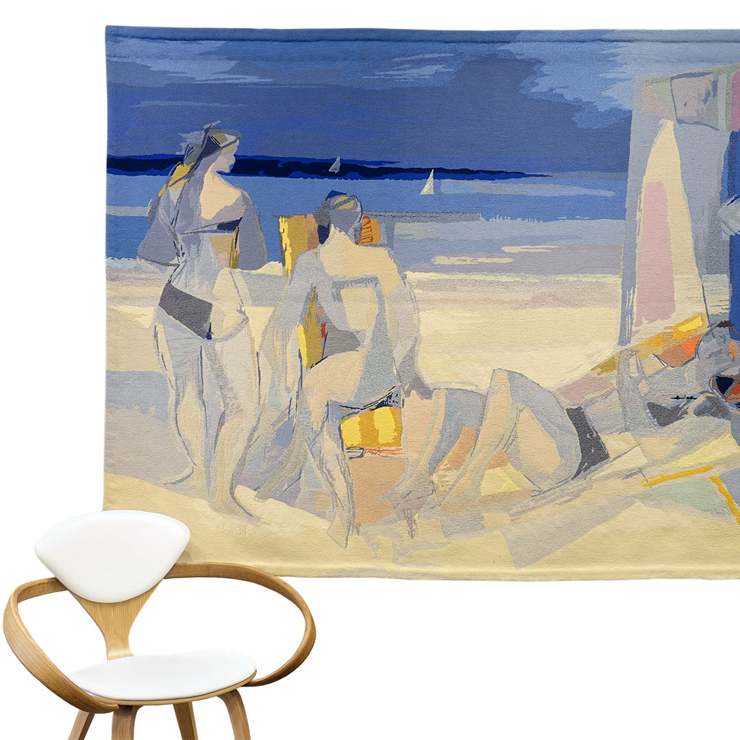This immense wool tapestry was hand-woven by the skilled artisans at Manufactura de Tapeçarias de Portalegre in Portugal, from a maquette by the artist. It is signed by the artist in the weave, signed by the fabricator “MTP fino” and initialed by the lead weaver “J.C.” on the verso. These large tapestries were made in editions of 1 to 8. We’ve never seen another “Bathers.”
