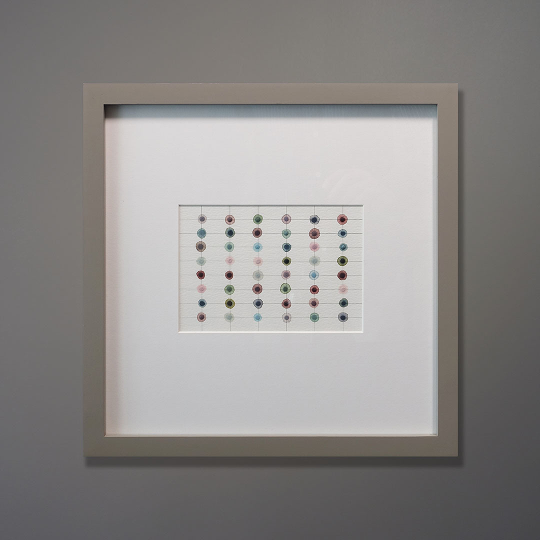 Peeks drew inspiration from the Washington D.C. Color School painters of the 1950s, especially Sam Gilliam, while she was living in Virginia. This artwork is distinctive because of the way the pattern responds to the viewer’s eye. A sense of movement, an awareness of the near-perfect design.