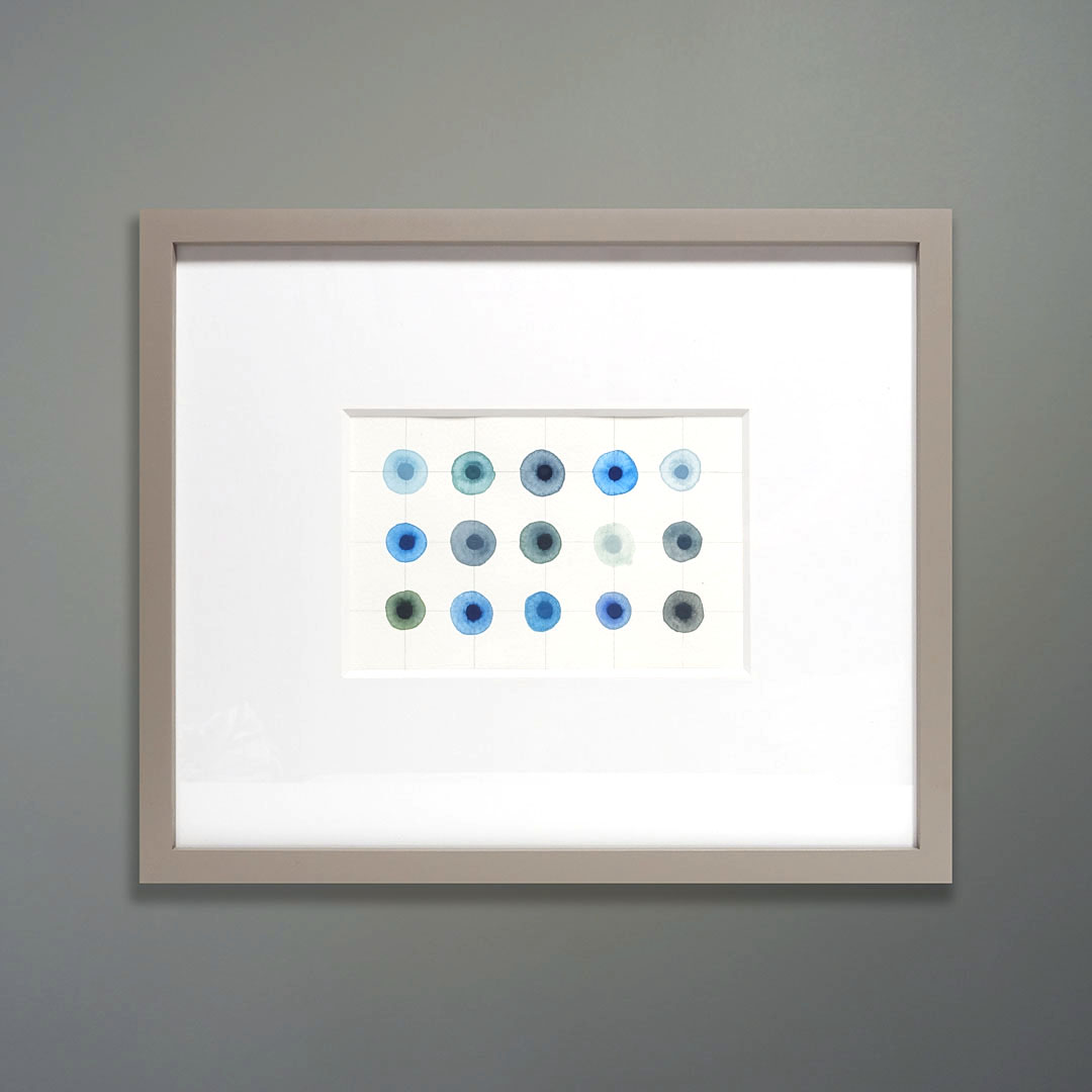 Original 6×9 inch watercolor painting on paper by Shelter Island artist Leah Peeks. Peeks drew inspiration from the Washington D.C. Color School painters of the 1950s, especially Sam Gilliam, while she was living in Virginia. This artwork is distinctive because of the way the pattern responds to the viewer’s eye. A sense of movement, an awareness of the near-perfect design. It is in an 8-ply acid-free mat and a minimalist gray wood frame faced with gallery glass. The overall framed size is 14×17 inches. Note: this painting may be hung either vertically or horizontally. These paintings pair well so view our other Peeks offerings. She’s a gallery best-seller.