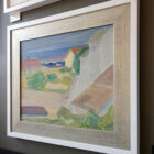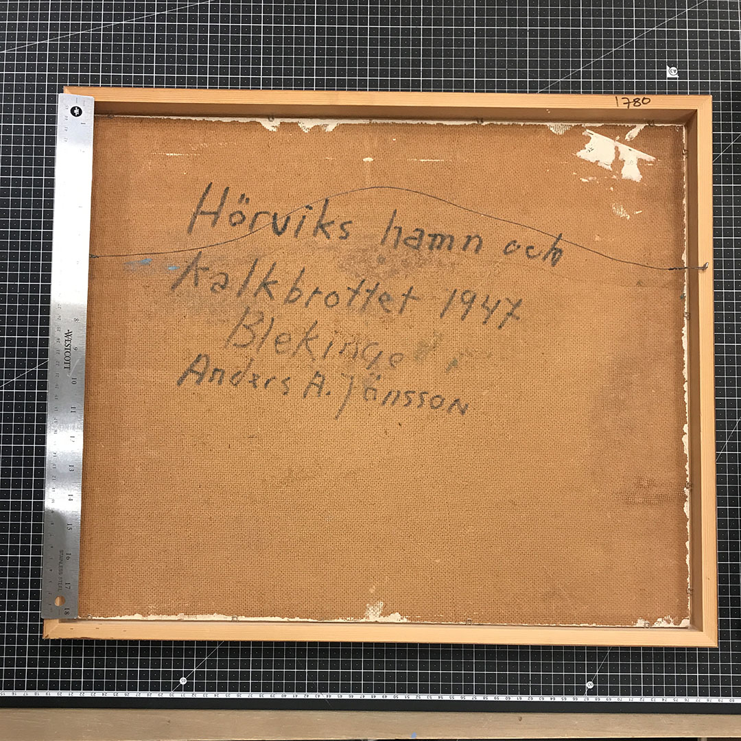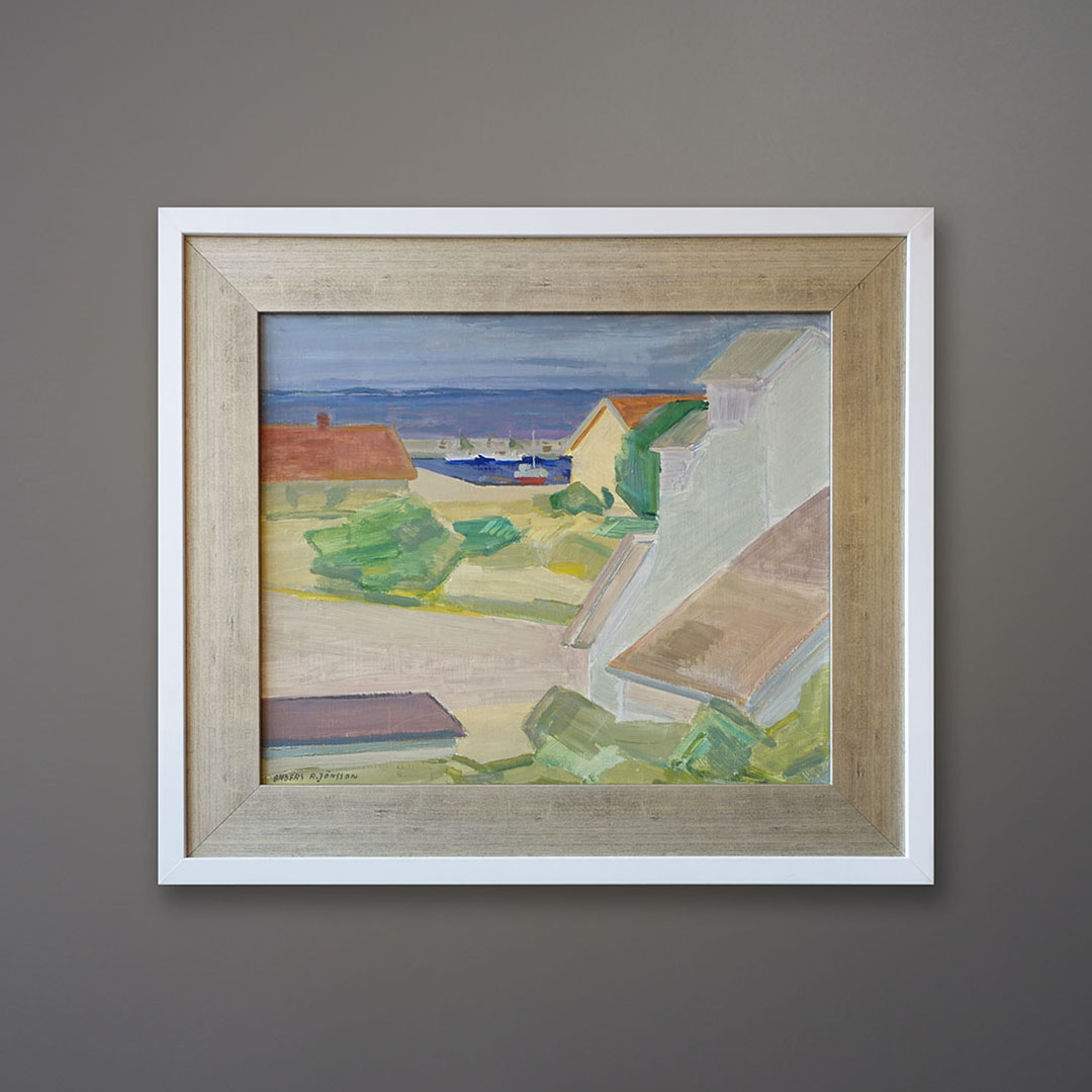 Coastal decor Mid-Century Modern original oil painting by Anders A. Jönsson, 1947, Sweden. Signed and dated. New double frame. Excellent condition for its age. Framed size is 25×29 inches. We think this painting of a Swedish harbor looks a lot like our scenic bay here on the North Fork. See our other listing by Signe Rydberg Jönsson… they were a married couple. Verso title “Hörviks hamn och kalkbrottet, 1947, Blekinge” or “Hörvik harbor and the lime quarry, 1947, Blekinge.” Blekinge is a county in southern Sweden facing the Baltic Sea.
