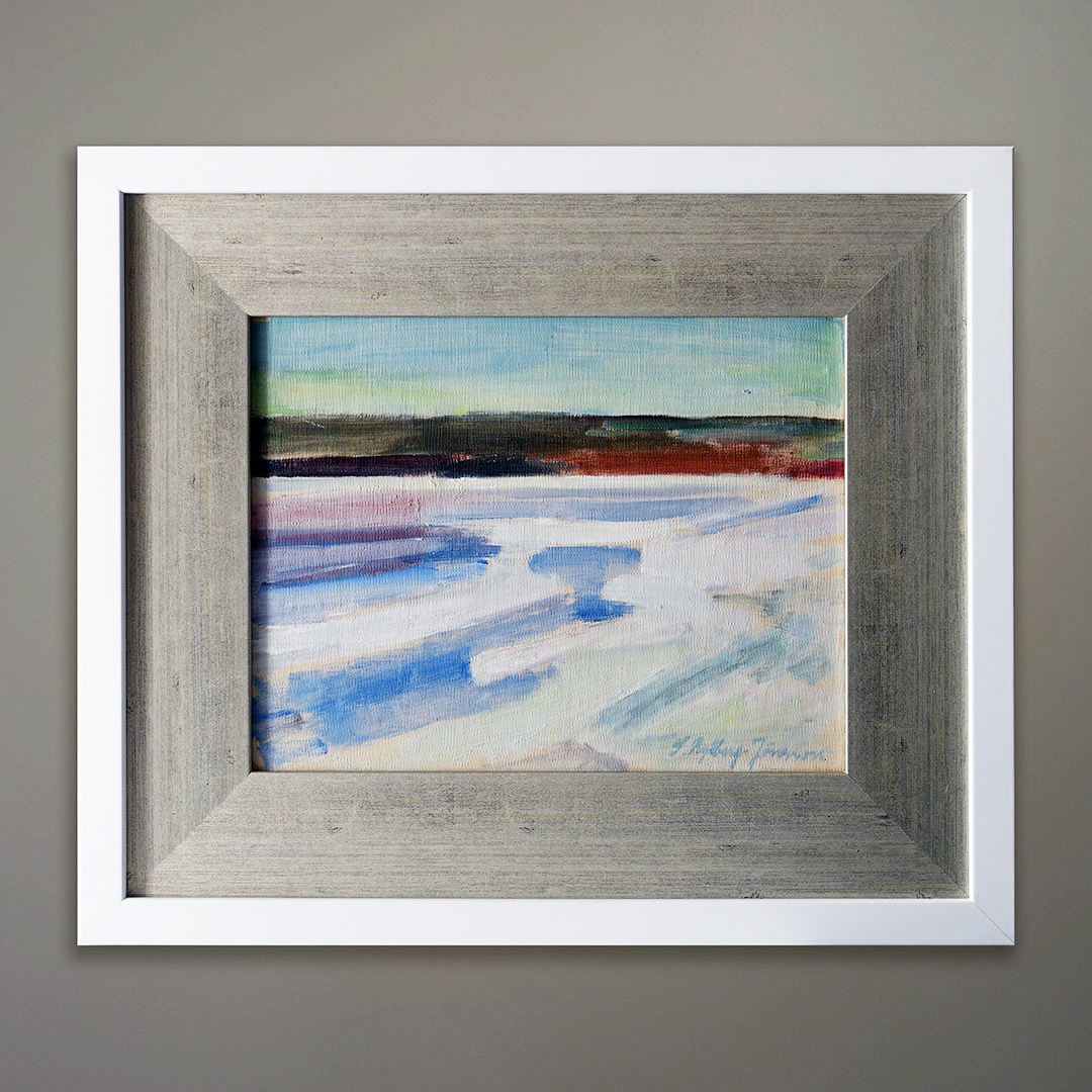 Coastal decor Mid-Century Modern original oil painting by Signe Rydberg Jönsson, 1940s, Sweden. Signed. New double hardwood frame. Excellent condition for its age. Framed size is 17×21 inches. We think this painting of a Swedish beach looks a lot like our scenic bay here on the North Fork. See our other listing by Anders A. Jönsson… they were a married couple.