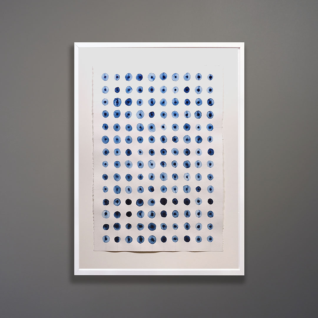 Original watercolor painting on paper by Shelter Island artist Leah Peeks, 2021. Peeks drew inspiration from the Washington D.C. Color School painters of the 1950s, especially Sam Gilliam, while she was living in Virginia. This artwork is distinctive because of the way the pattern responds to the viewer’s eye. A sense of movement, an awareness of the near-perfect but also not-perfect design. It is float mounted in a minimalist white matte wood frame faced with gallery acrylic. The overall framed size is 30×37 inches. This artwork may be displayed horizontally or vertically. Signed on the back. Due to the size and/or weight of this piece we recommend contacting us for a shipping estimate. We use FedEx and can generally ship for under $100.
