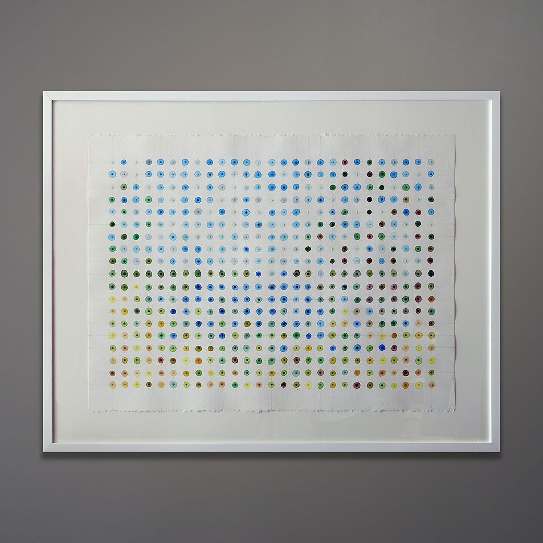 Peeks drew inspiration from the Washington D.C. Color School painters of the 1950s, especially Sam Gilliam, while she was living in Virginia. This artwork is distinctive because of the way the pattern responds to the viewer’s eye. A sense of movement, an awareness of the near-perfect but also not-perfect design. It is float mounted in a minimalist white matte wood frame faced with gallery acrylic. The overall framed size is 30×37 inches. Signed on the back.