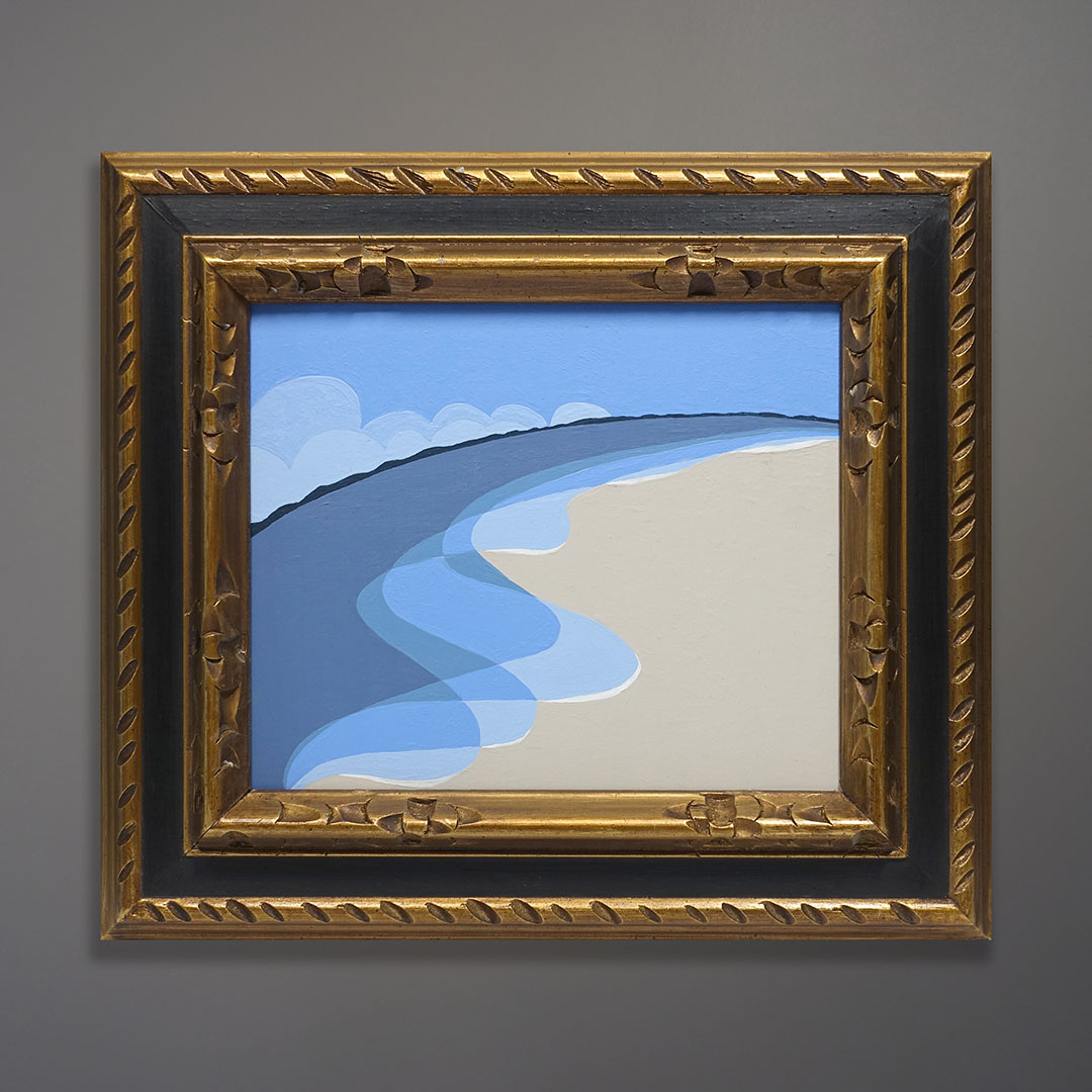 An original polymer painting series on masonite by Michael Aron titled “Orient Beach IV” dated 2021. It measures 14½×17 inches. It is in a vintage gold leaf on hardwood frame.