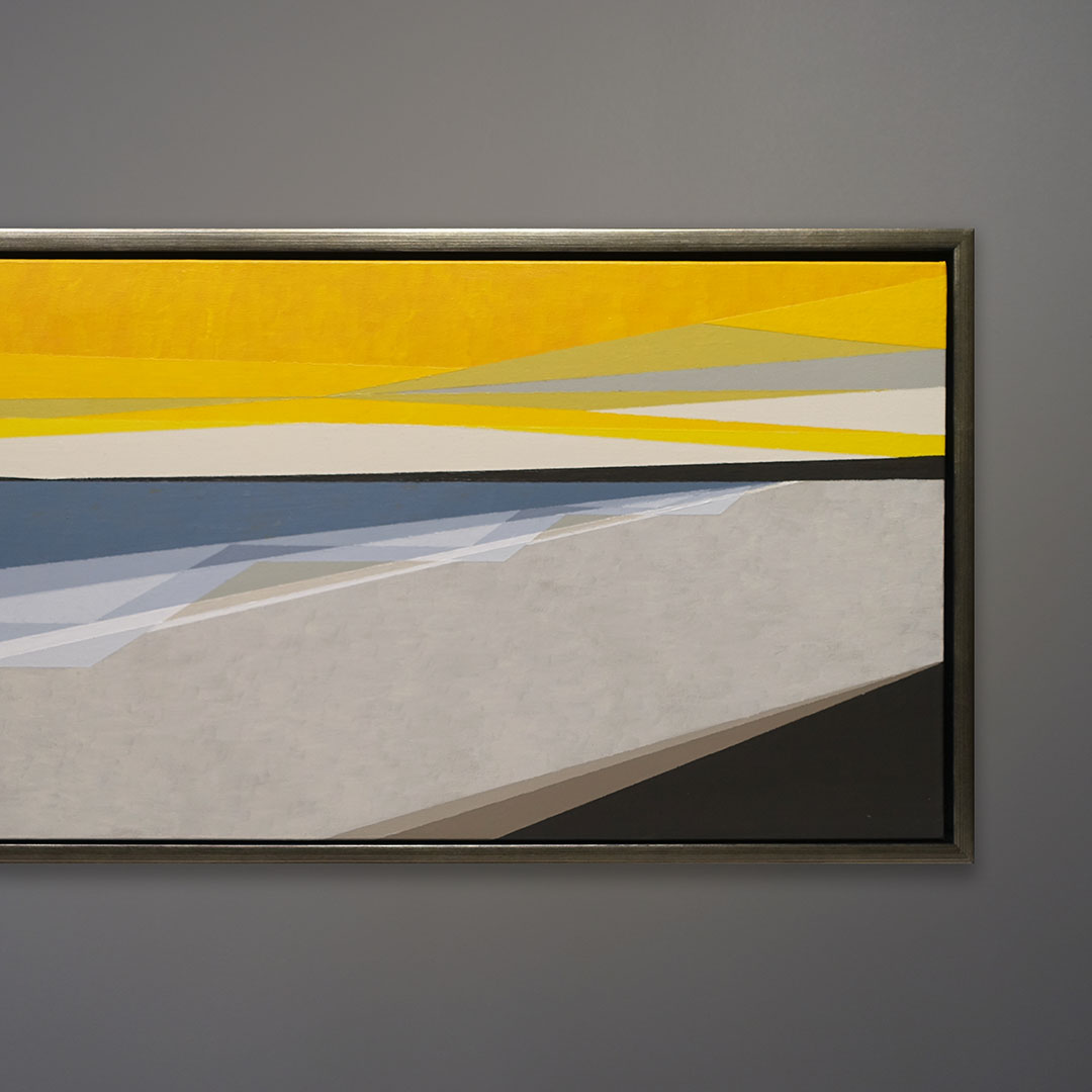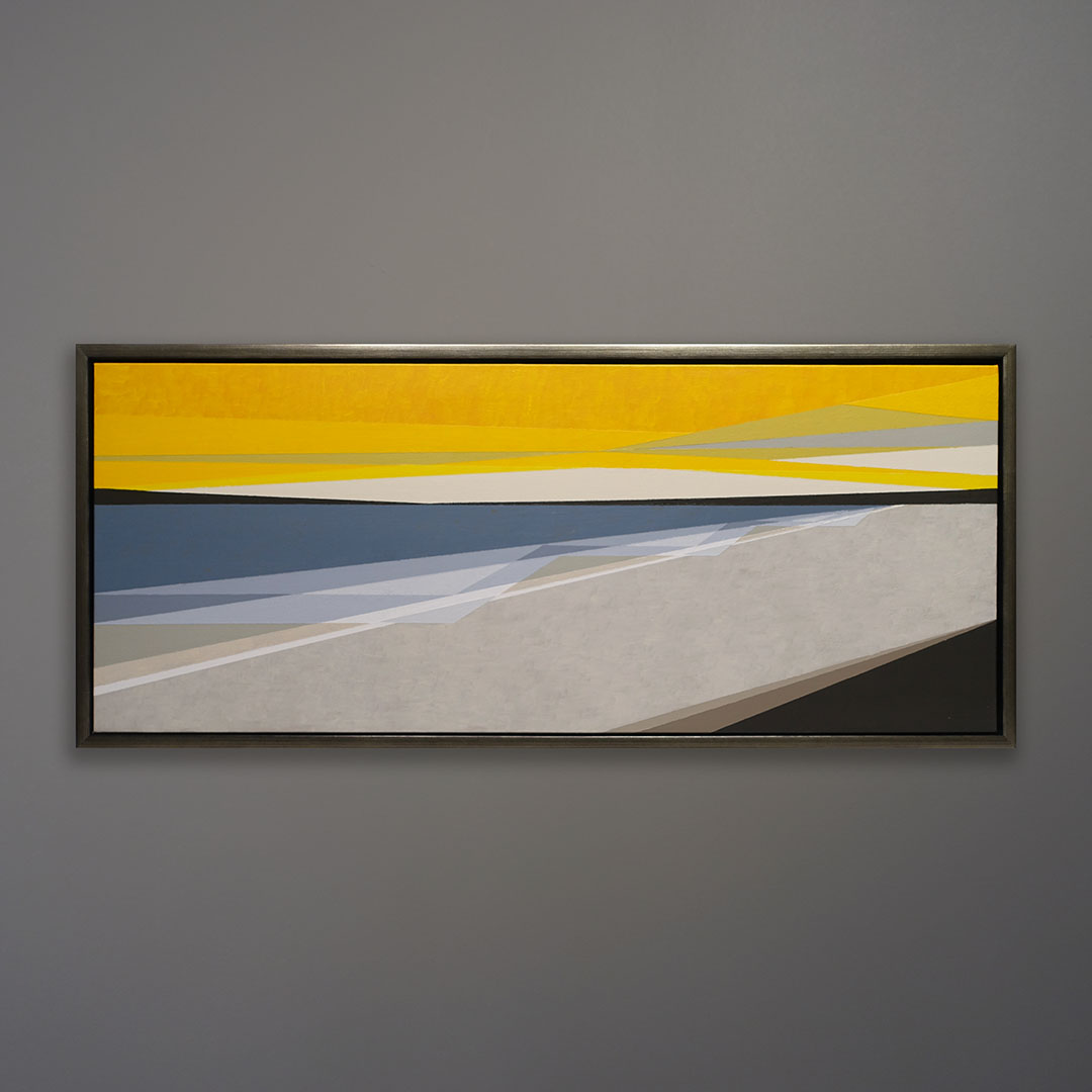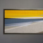 An original polymer painting on canvas by Michael Aron, 2021, titled “Orient NY Beach V.” It depicts an abstracted view of Peters Neck Point and the Peconic River as seen from Orient Beach State Park, in Orient New York at the very tip of the North Fork of Long Island. The overall size is 17×41 as float framed in warm silver with black edges.