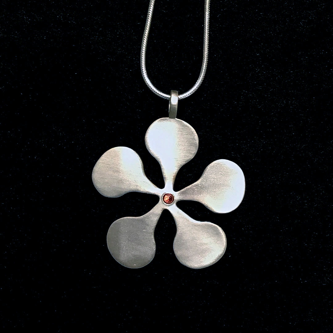 1960s mod style pendant by Meryl Waitz in .925 matte sterling silver with a 3mm rhodolite garnet cabochon in the center. It’s on a 16 inch sterling silver snake chain or a fine sterling linked chain. Groovy! Meryl Waitz has a BFA in Architecture from Parsons School of Design, has sold at boutiques worldwide including Barneys, and has designed for Trina Turk and Estée Lauder. Hand made in New York City.
