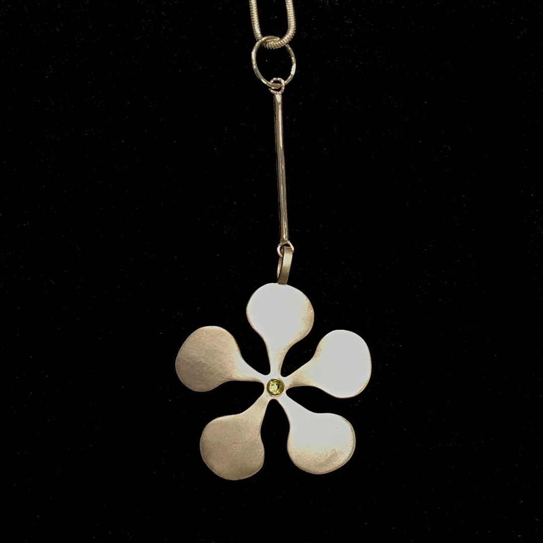 1960s mod style pendant by Meryl Waitz in .925 matte sterling silver with a 3mm peridot cabochon in the center. It’s on a sterling silver snake chain. Groovy! Meryl Waitz has a BFA in Architecture from Parsons School of Design, has sold at boutiques worldwide including Barneys, and has designed for Trina Turk and Estée Lauder. Hand made in New York City.