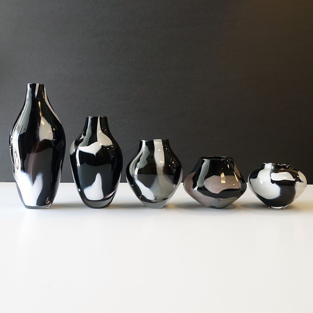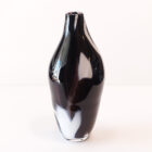 12 inch tall art glass vase by Jesse Reece, 2010. This artwork features thick black, gray, white, and clear glass in an abstract expressionist design. Ray is honored to present collectible one-of-a-kind functional glass sculptures by Jesse Reece of East Marion, NY. Reece is a highly creative glass artist know for his large, sculptural objects in vivid colors and textures. Each piece is unique, a result of the mouth-blown, hand-shaped process of one-man glassmaking.